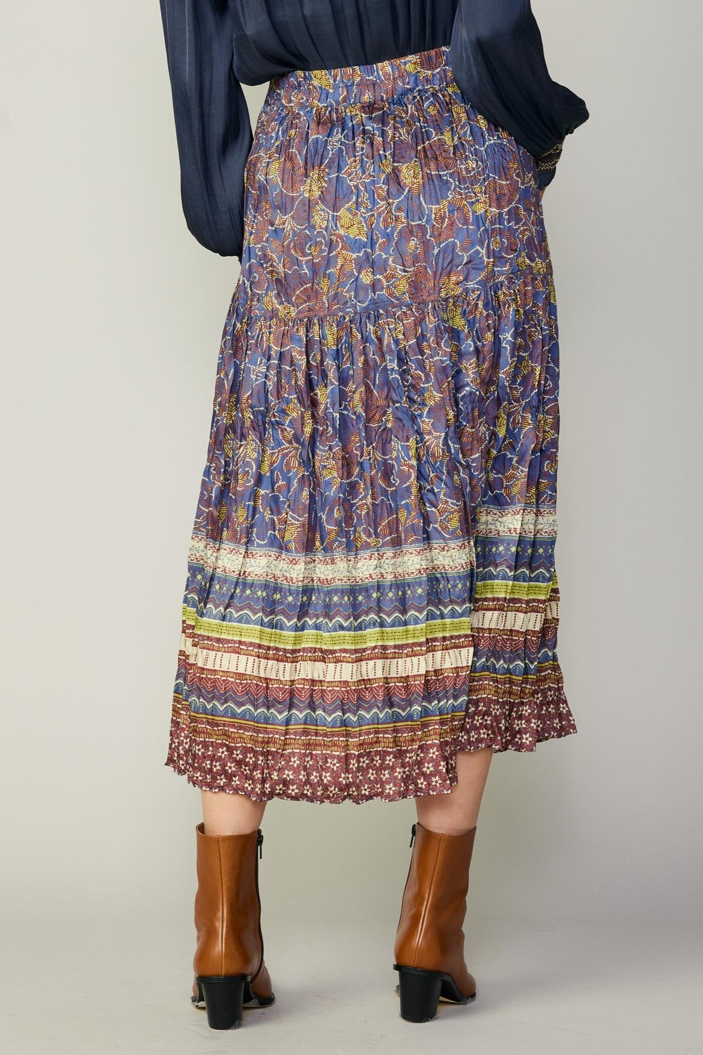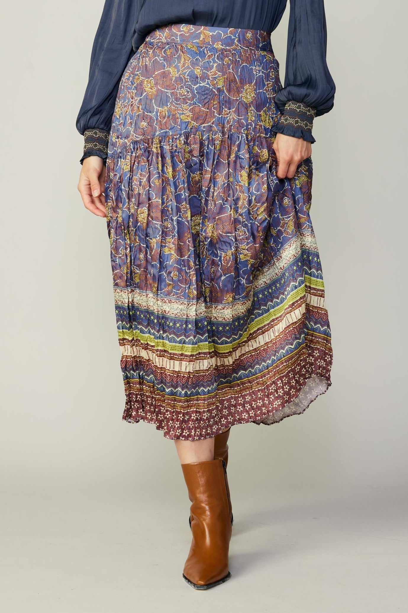 This midi skirt is very flattering with gathered detailing, a mid-length hem, and the floral border print that will be sure to get compliments. The skirt would look great as a casual outfit or dressed up!