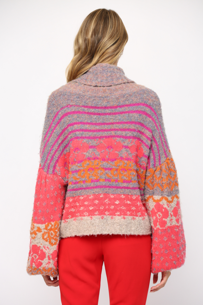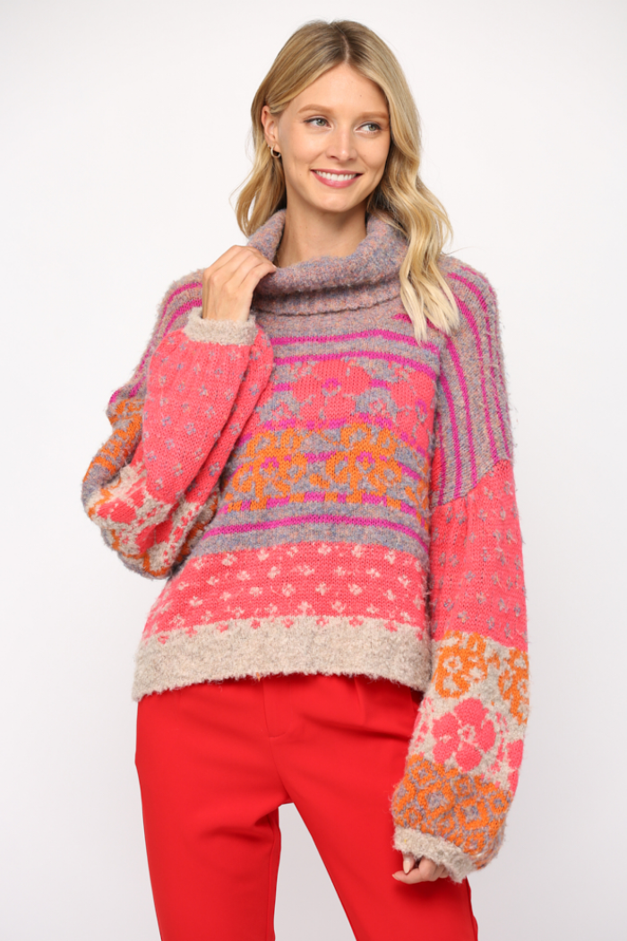 Floral Pattern Turtle Neck Fuzzy Sweater