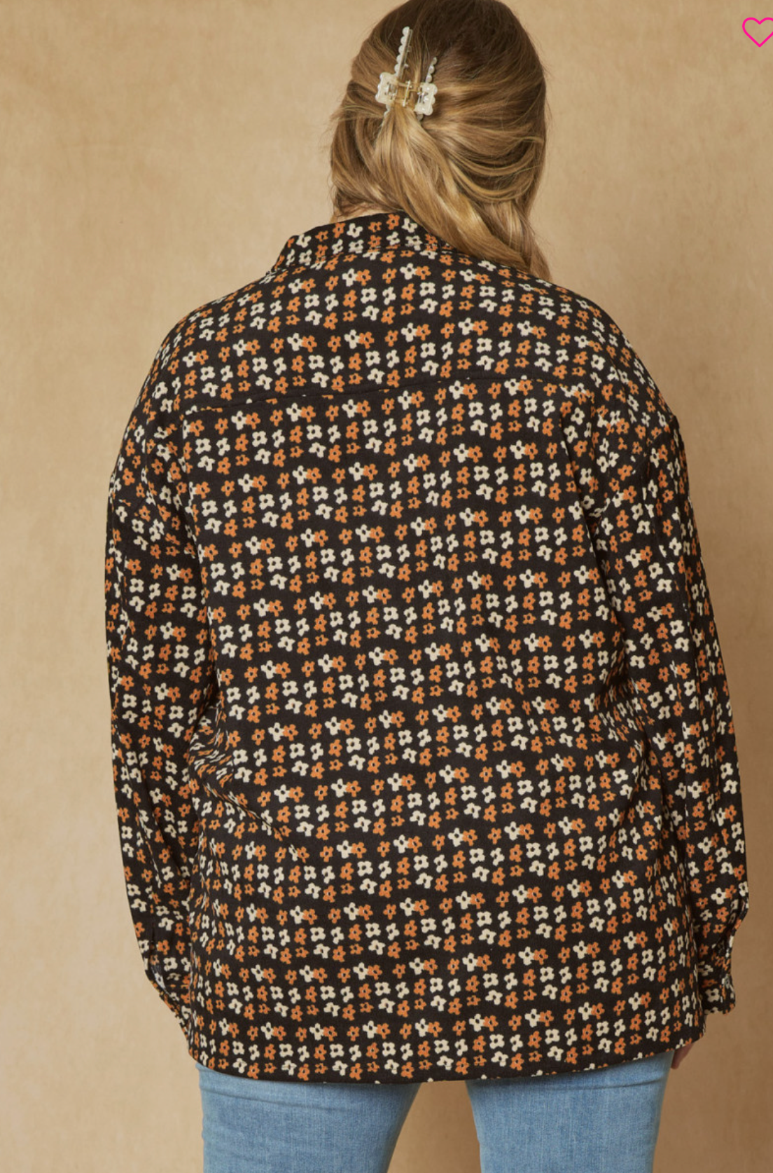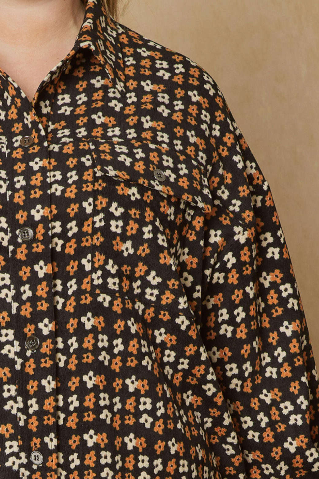 Floral print corduroy collared button up long sleeve top featuring pockets at bust. Unlined. Woven. Non-sheer. Lightweight.