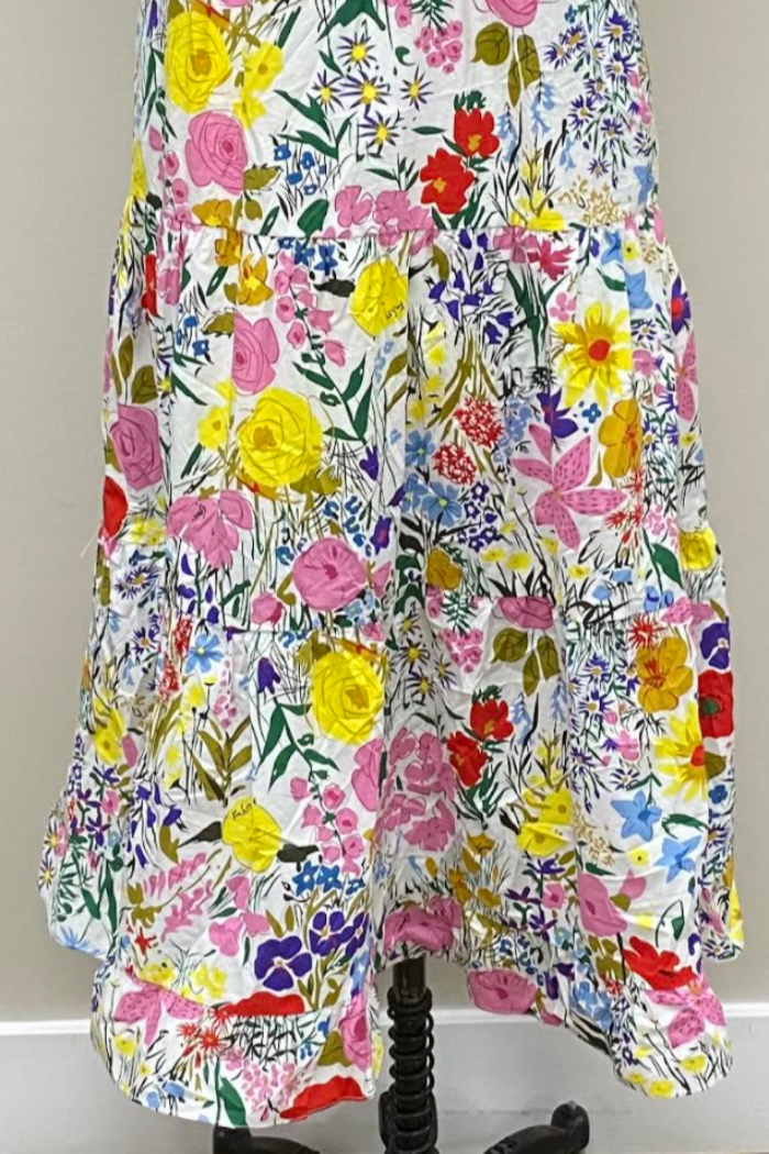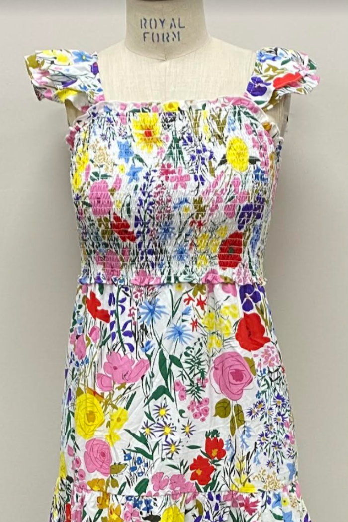 This midi dress is great for summer. The floral print is nice and bright, the smocking is great for showing shape and the ruffle sleeve is nice and feminine.
