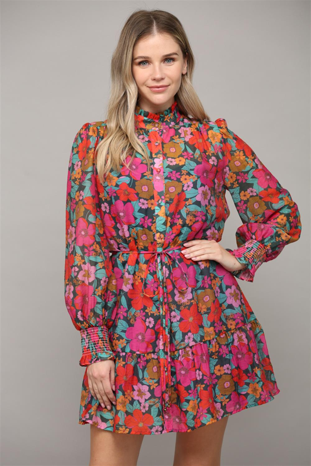 This floral dress gives you a pop of color to brighten your mood! The ruffle layer and tie waist, along with button up style are all flattering features that will be sure to make you look amazing in this dress.