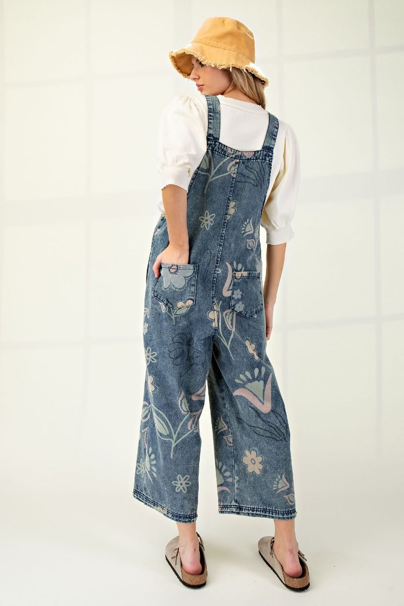 Description: FLORAL PRINT WASHED DENIM JUMPSUIT PANTS