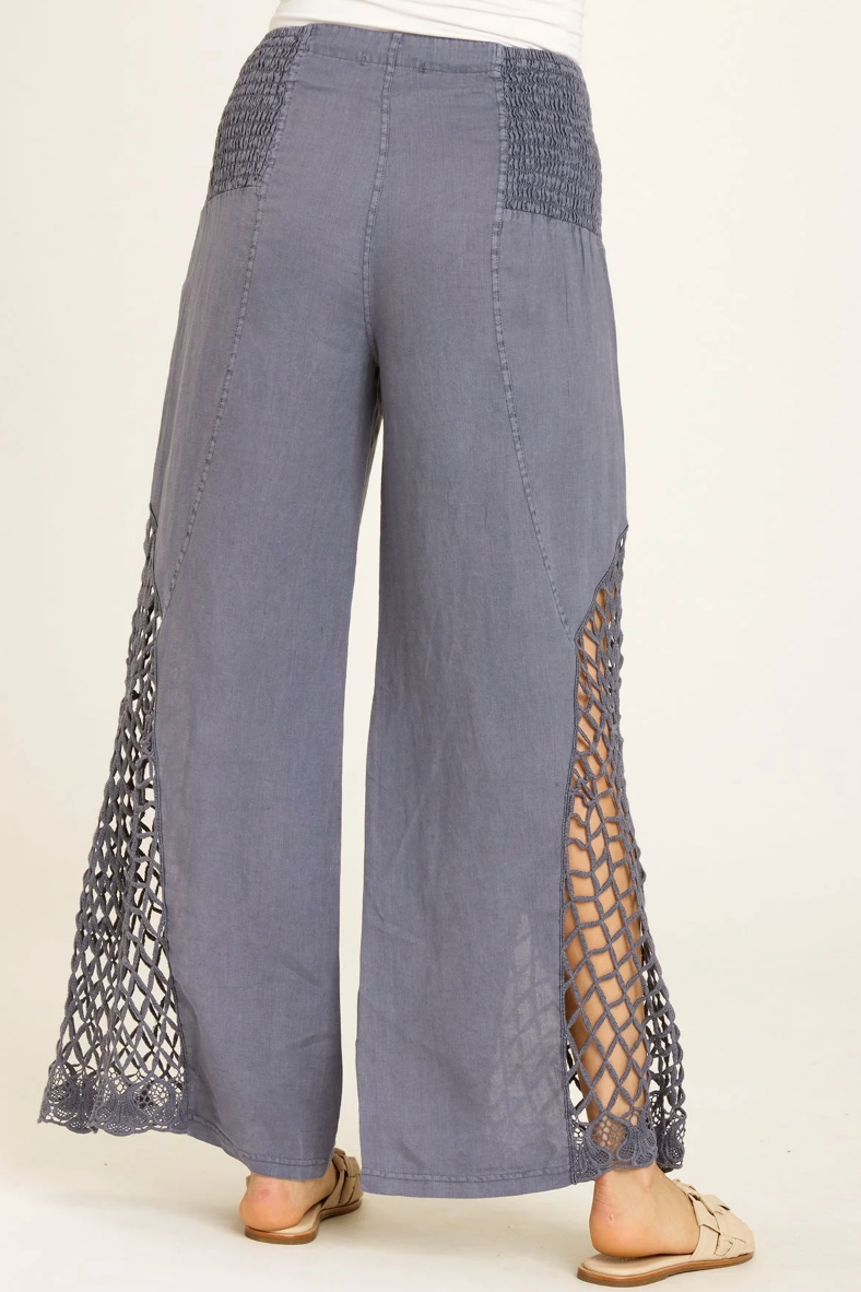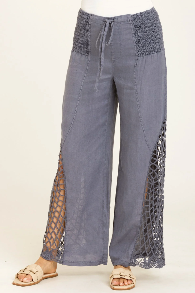 With a drawstring smocked waistband and wide leg silhouette, the Florin Pant is breezy and comfortable to wear. These pants have a bohemian style with crochet side panel detailing.