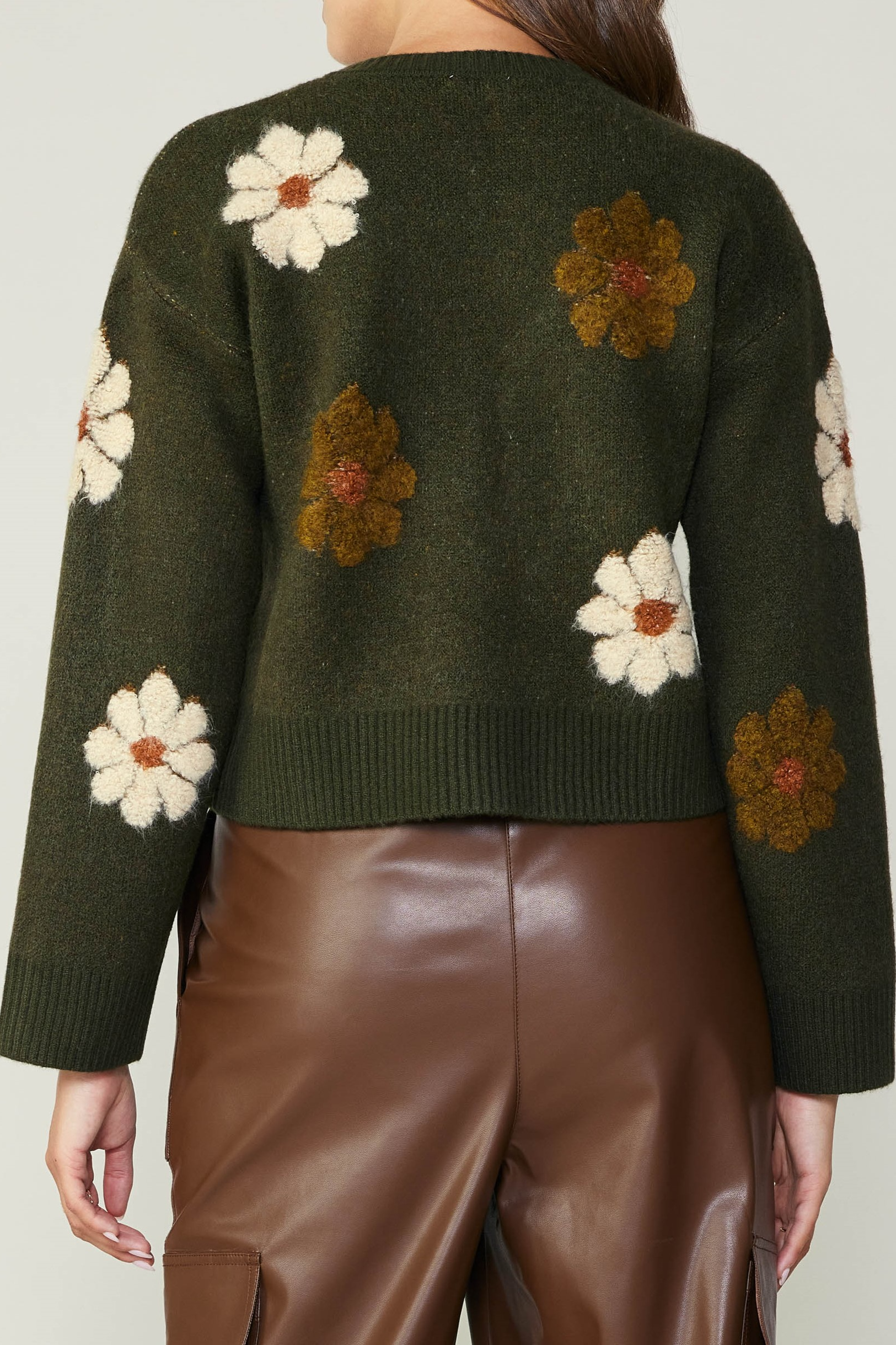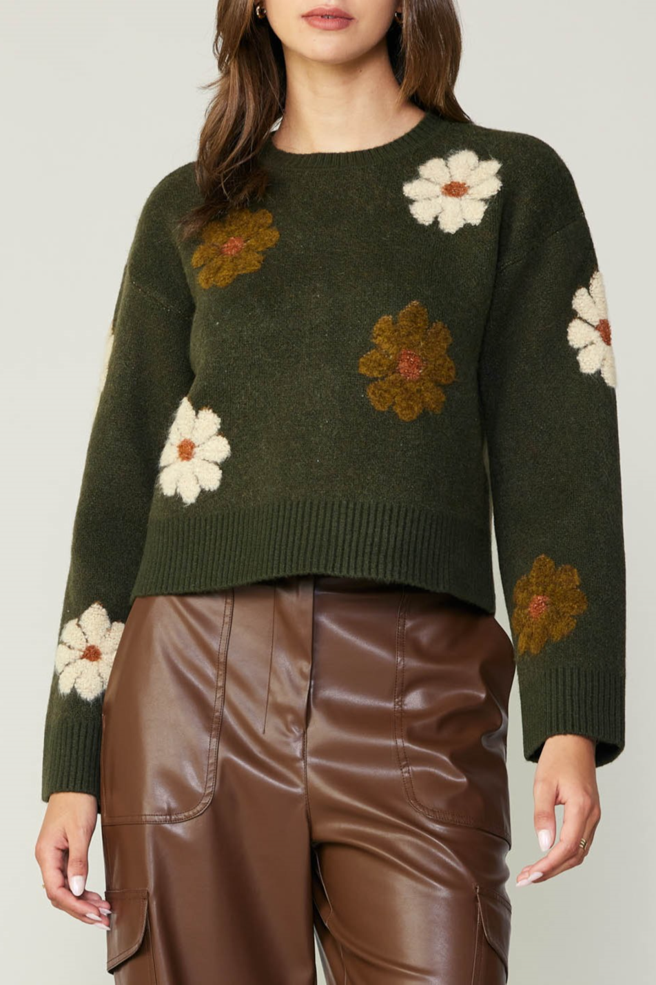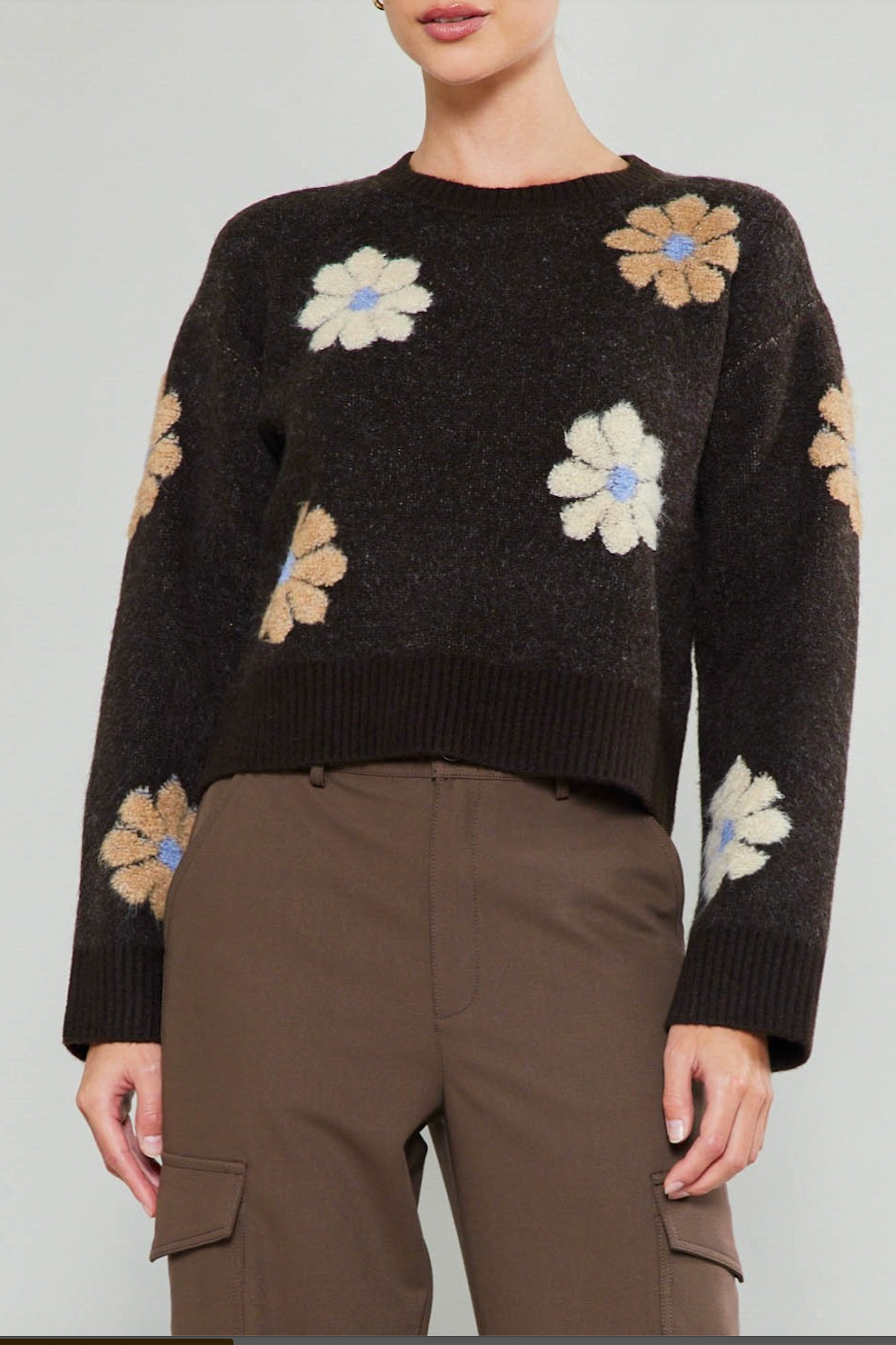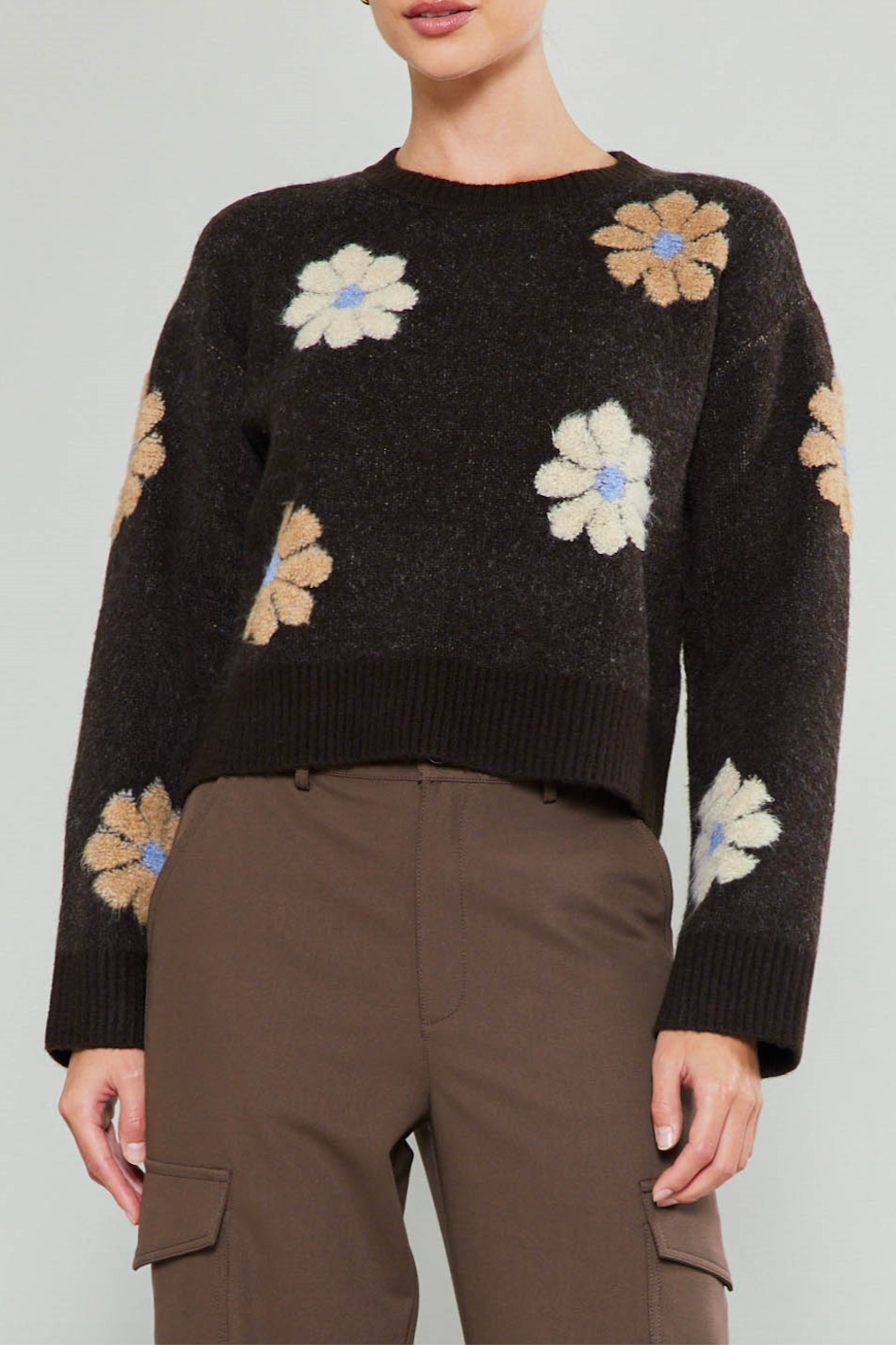 Hop on the flower trend for fall or winter! Swap out your basic sweatshirt for this fancied-up version featuring a textural daisy floral embroidery. Floral embroidery is spun in creme and taupe for a playful contrast against brown knit. Comfy and cute.