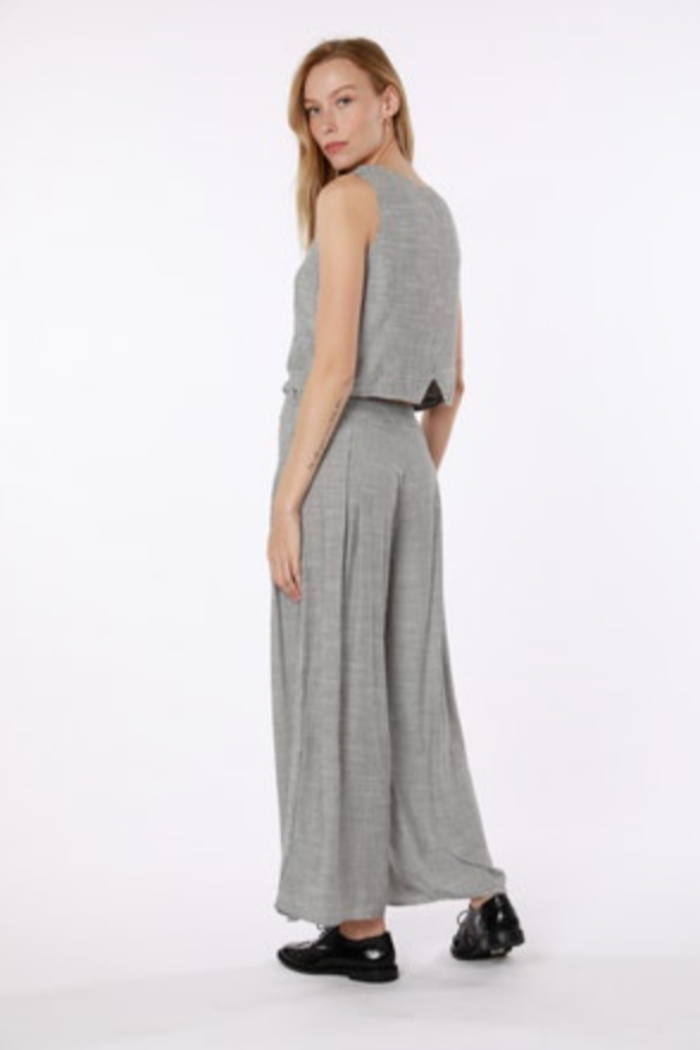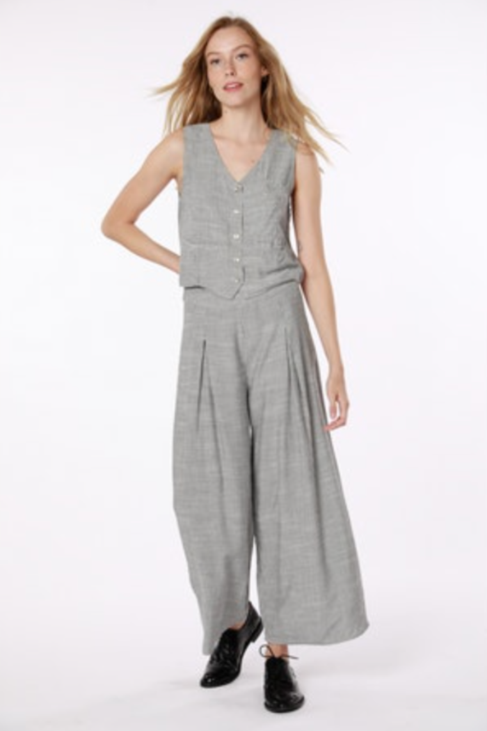These flowy pants look great with the matching button up vest for a dressed up look. Or pair with a basic white tank.