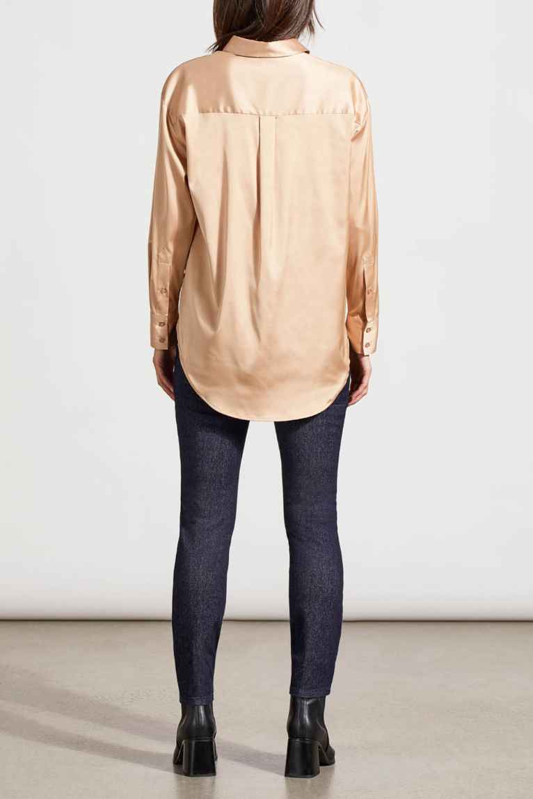 Long sleeve, flowy, satin button up shirt in a champagne beige. Pair with with the Sophia slim ankle jean with rose gold coating and head out for the night to celebrate.