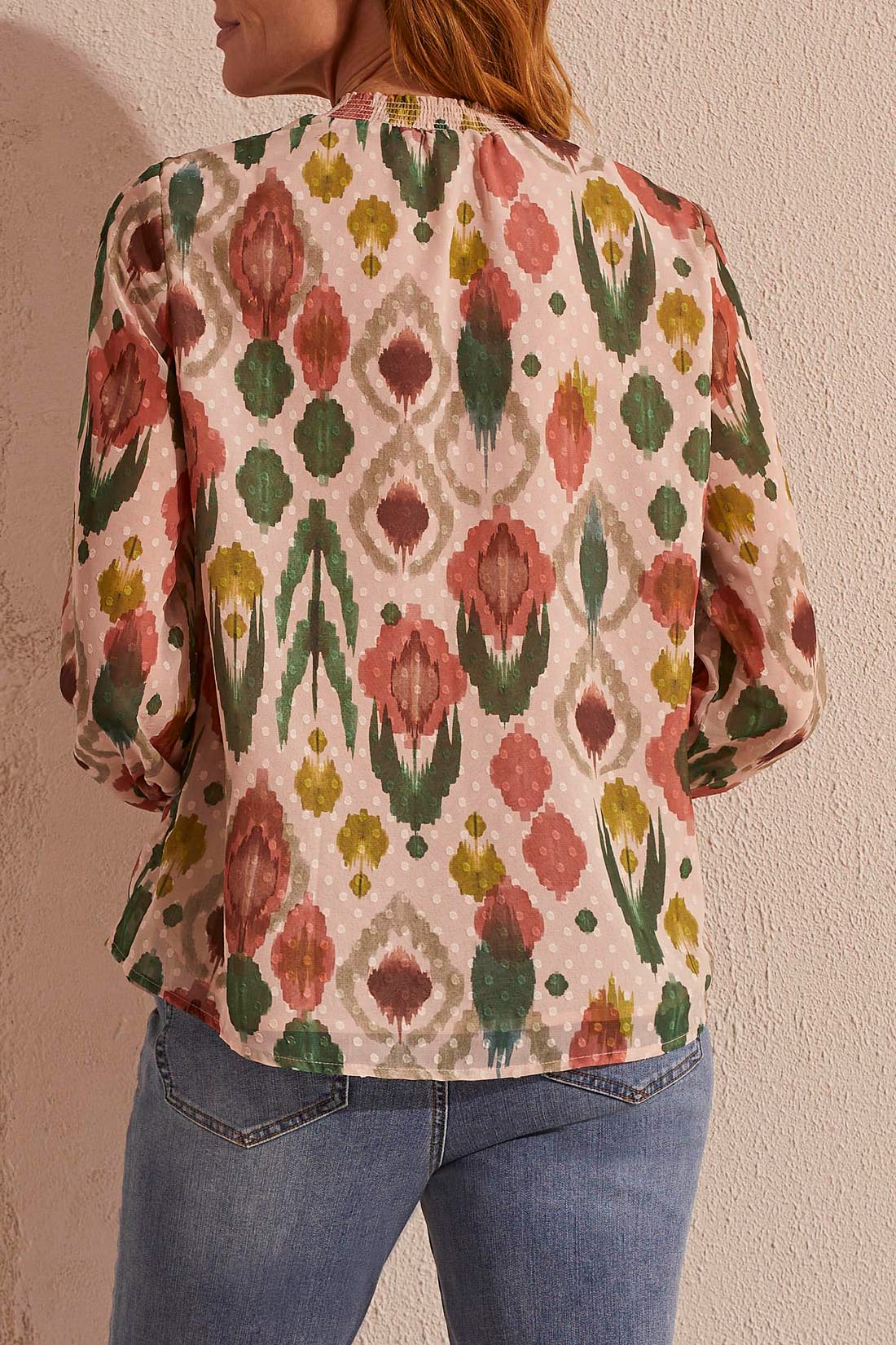 This top can be worn with either denim pants or dress pants. Office or evening out. Slight V-neck neckline with tie closure.