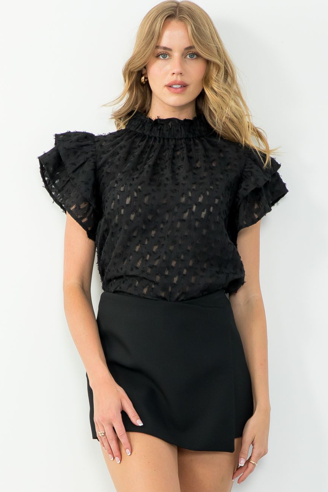 Add a little flare to your outfit with this fringe detail ruffle sleeve top. More than just a plain black top the flutter sleeves bring out an extra and fun quality to wear.