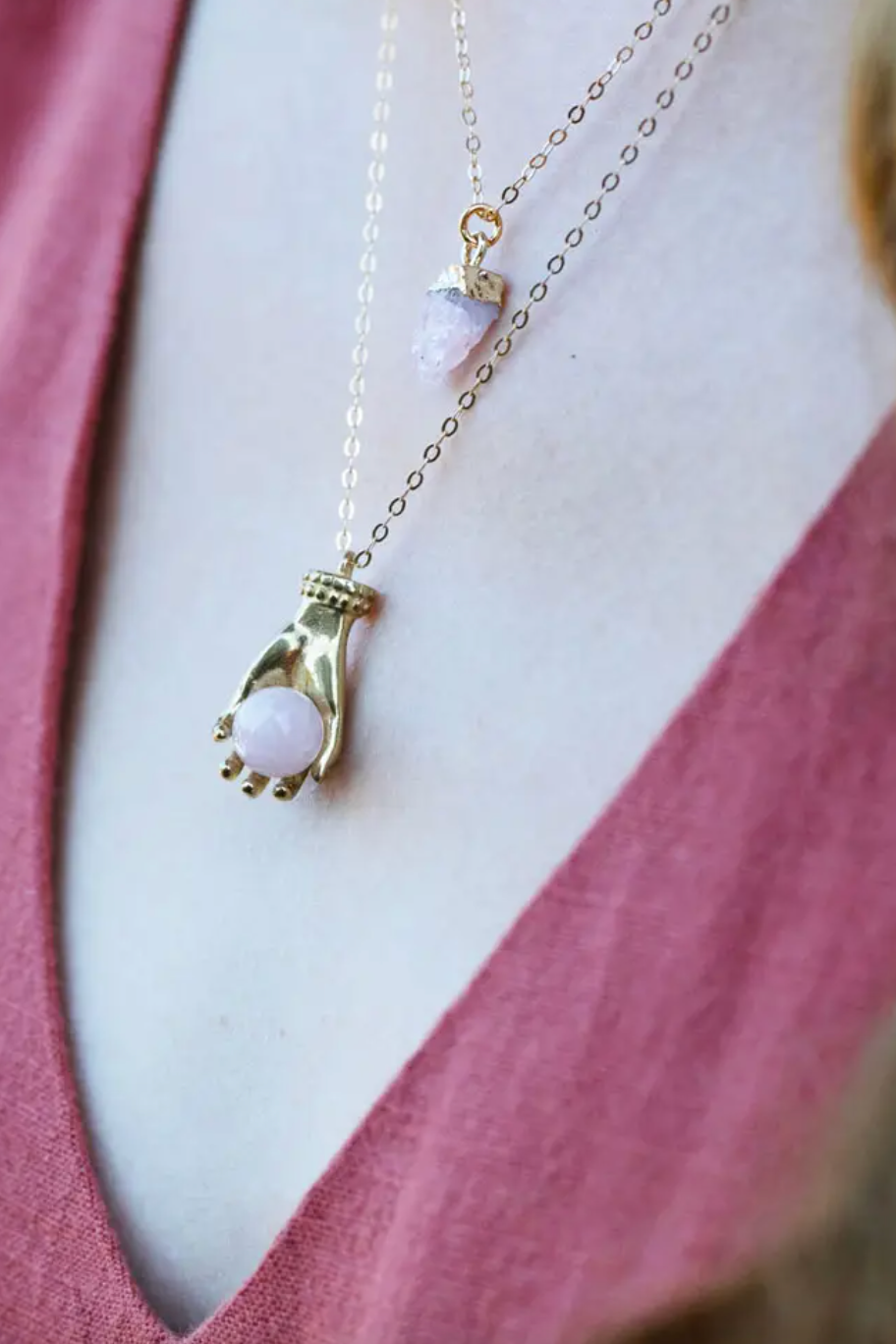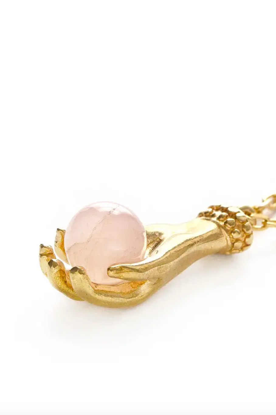 Cast in jeweler's brass the hand hangs on 20" 14k gold plated chain (coated to resist tarnish).