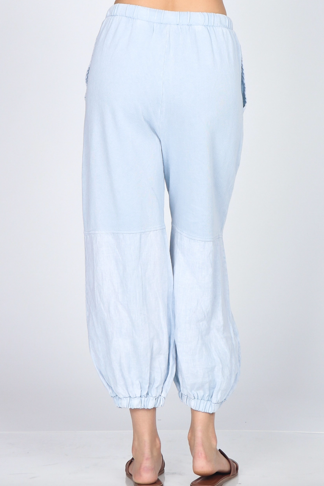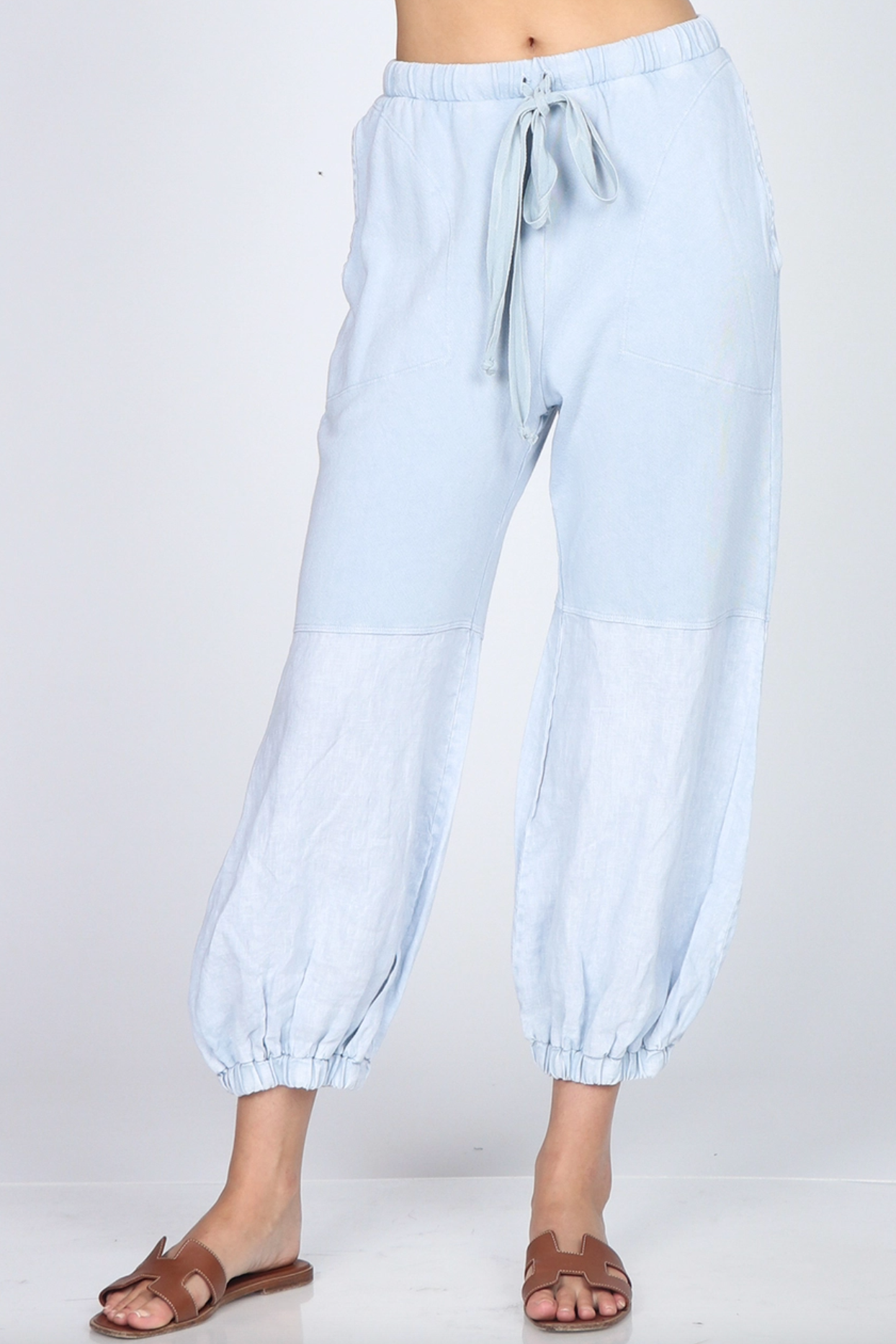 These french terry combination joggers are everyone's favorite, featuring its fun 100% linen contrast panels. A true must-have for Spring/Summer!