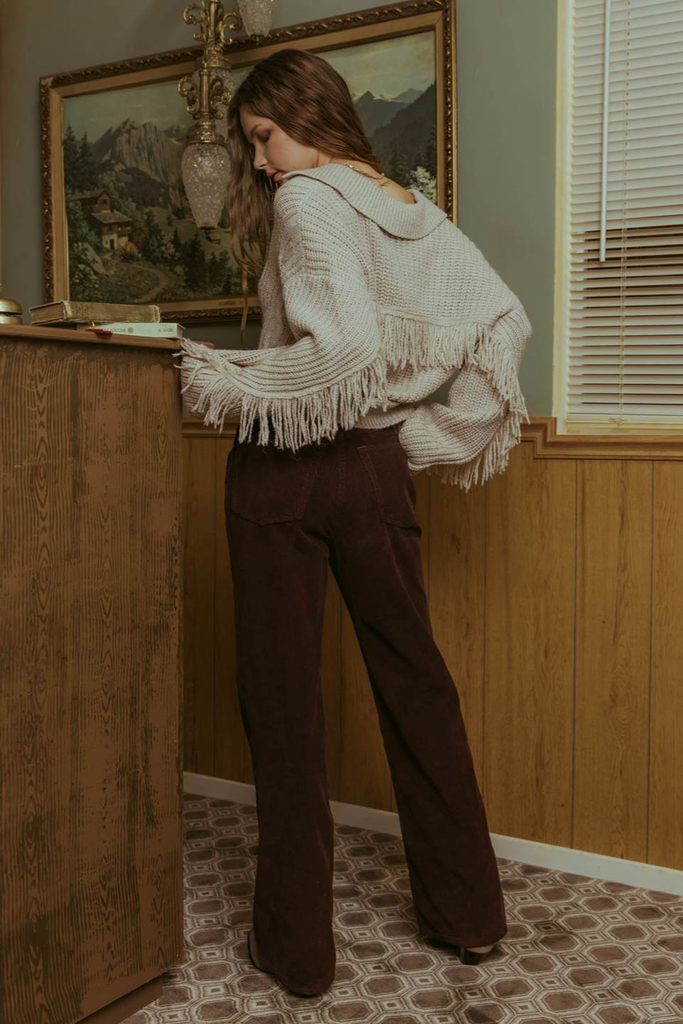 The fringe sets this cozy sweater aside. With a nice streamlined look, this sweater will pair well with any pant or jeans you have.