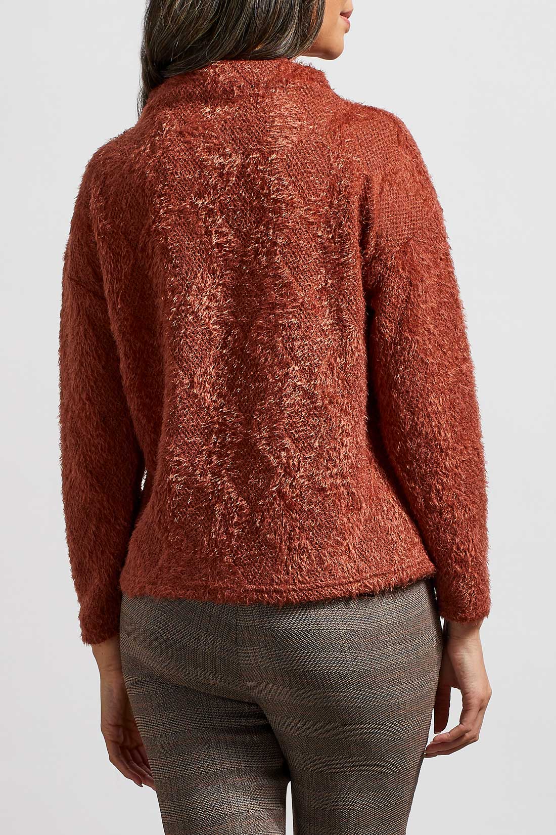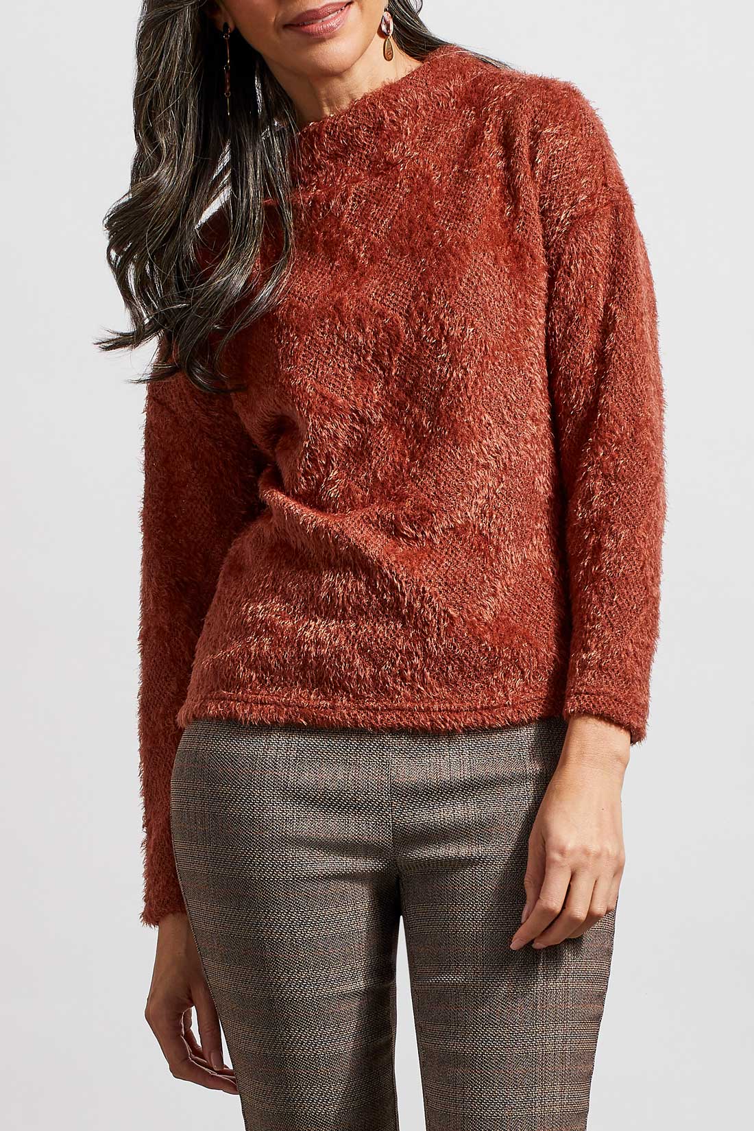 Have some fun with your style and try wearing textures this season. This funnel neck top is a pretty copper shade for fall and has a textured pattern.