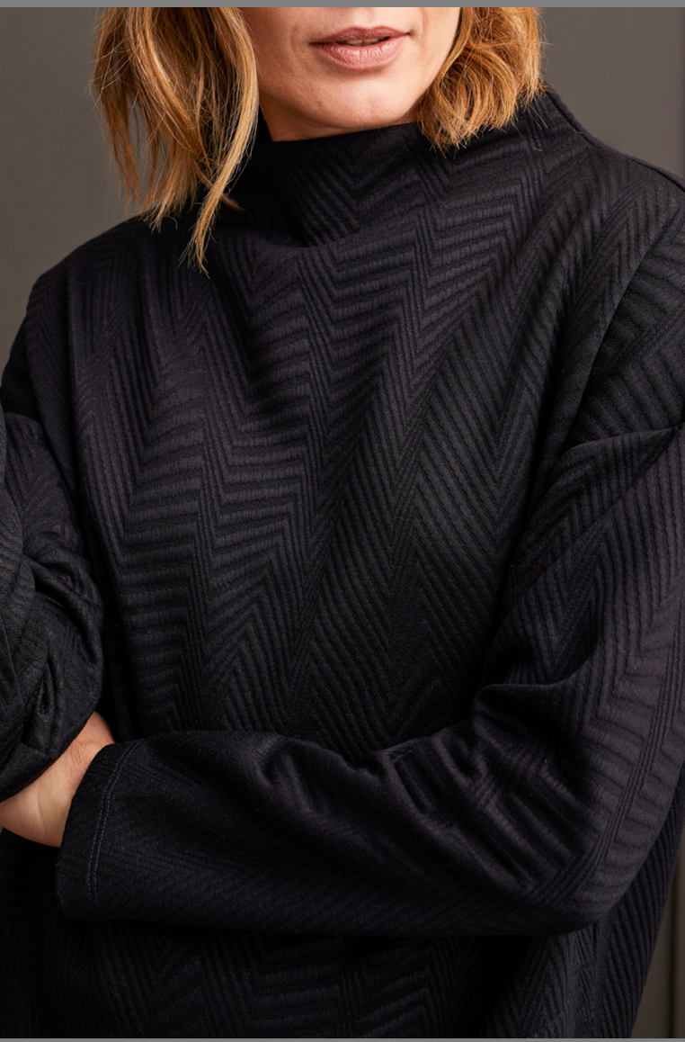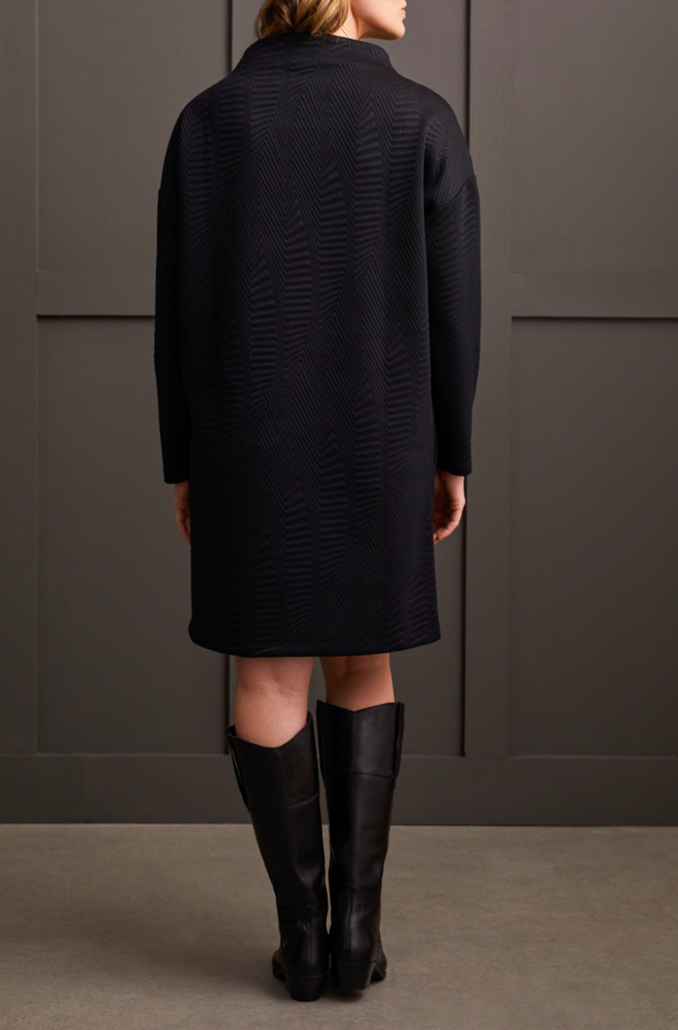 Casual, easy dress with side pockets and a funnel neck. Fabric has detail throughout. Great travel dress!