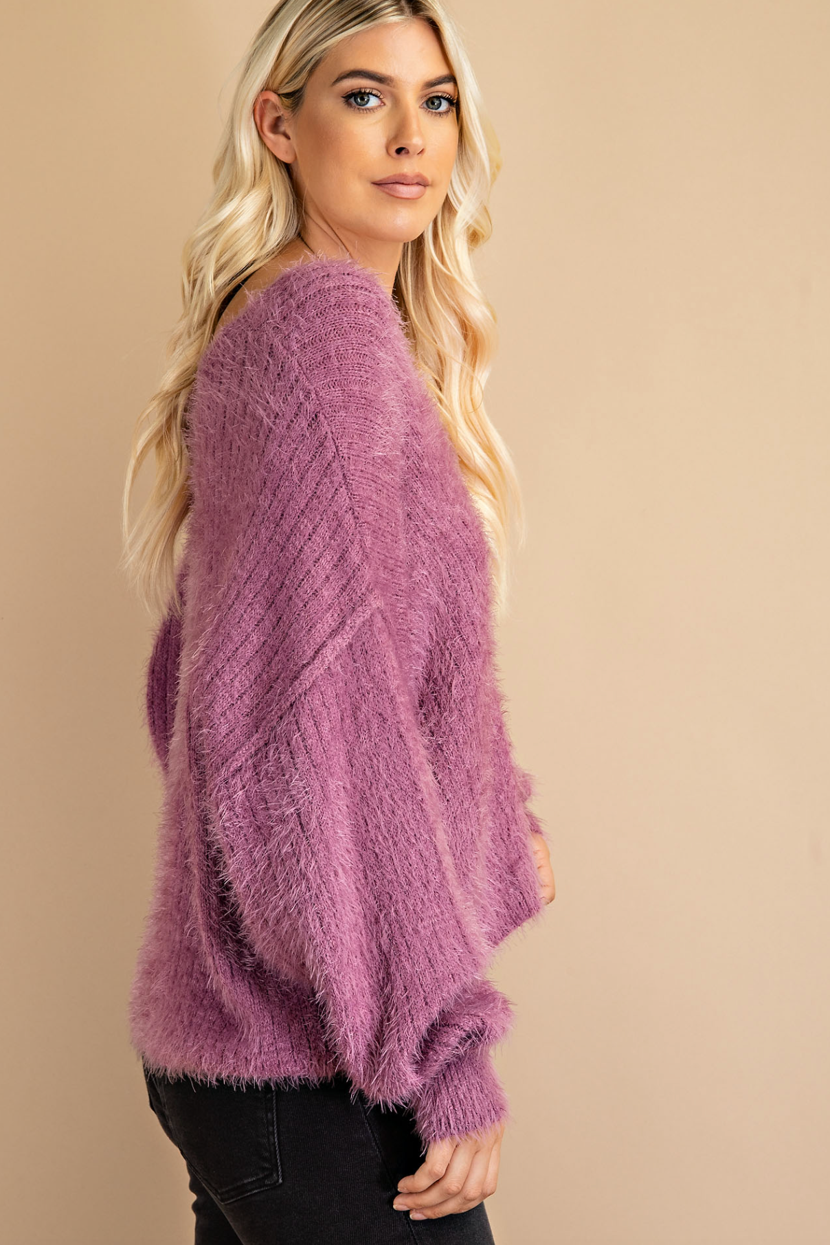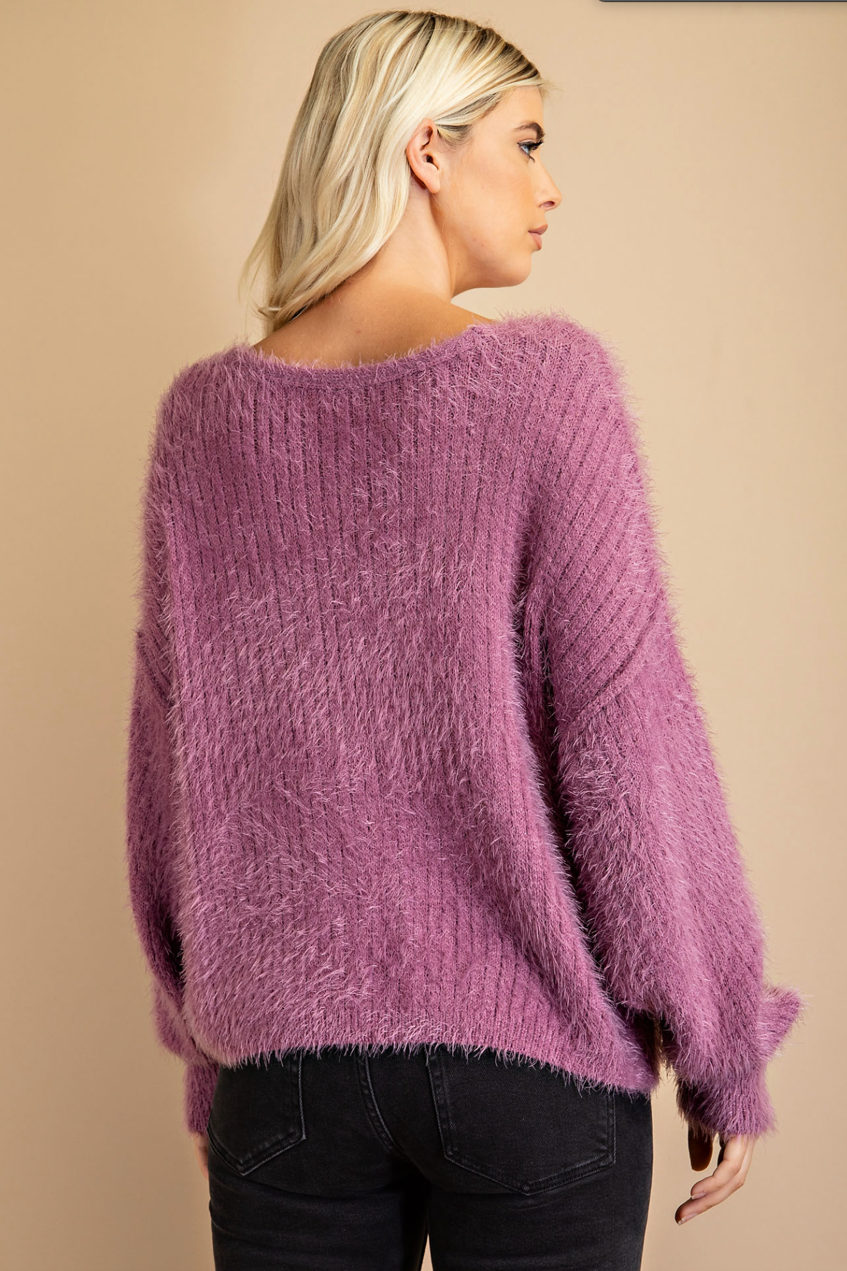Fuzzy v-neck sweater in mauve is great for fall. Super cozy and looks great with a denim bottom and boots.