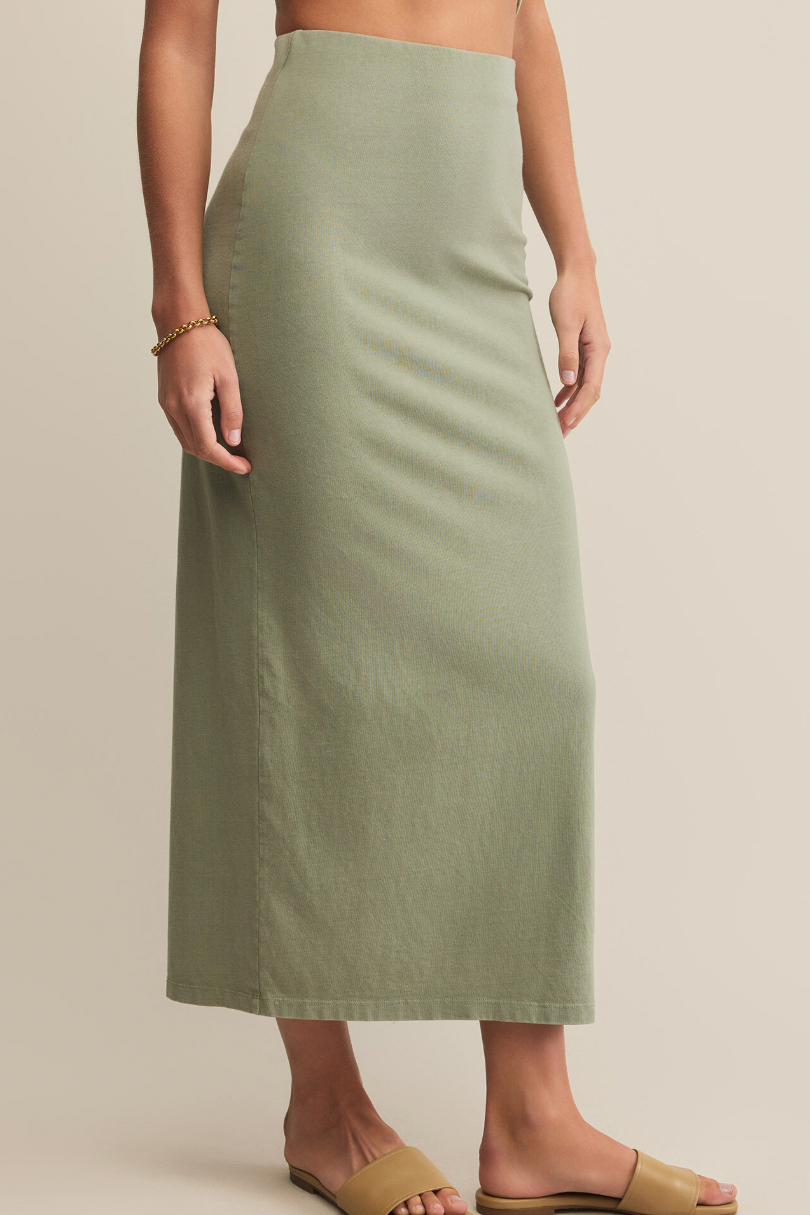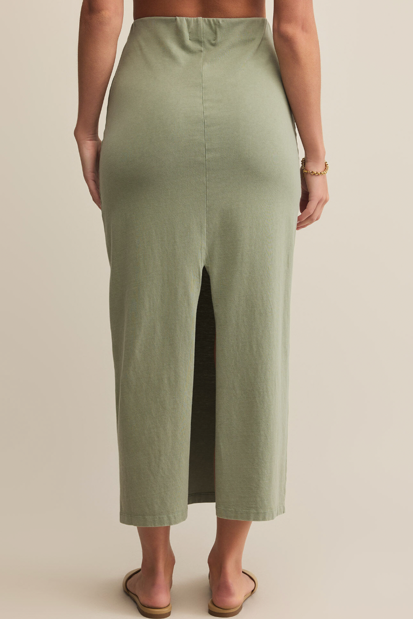 The Gail Midi Skirt has a sleek minimalist style with a smooth, fitted silhouette. The effortless and relaxed style of this skirt is ideal for casual and semi-formal occasions. Pair with sandals to compliment the look.