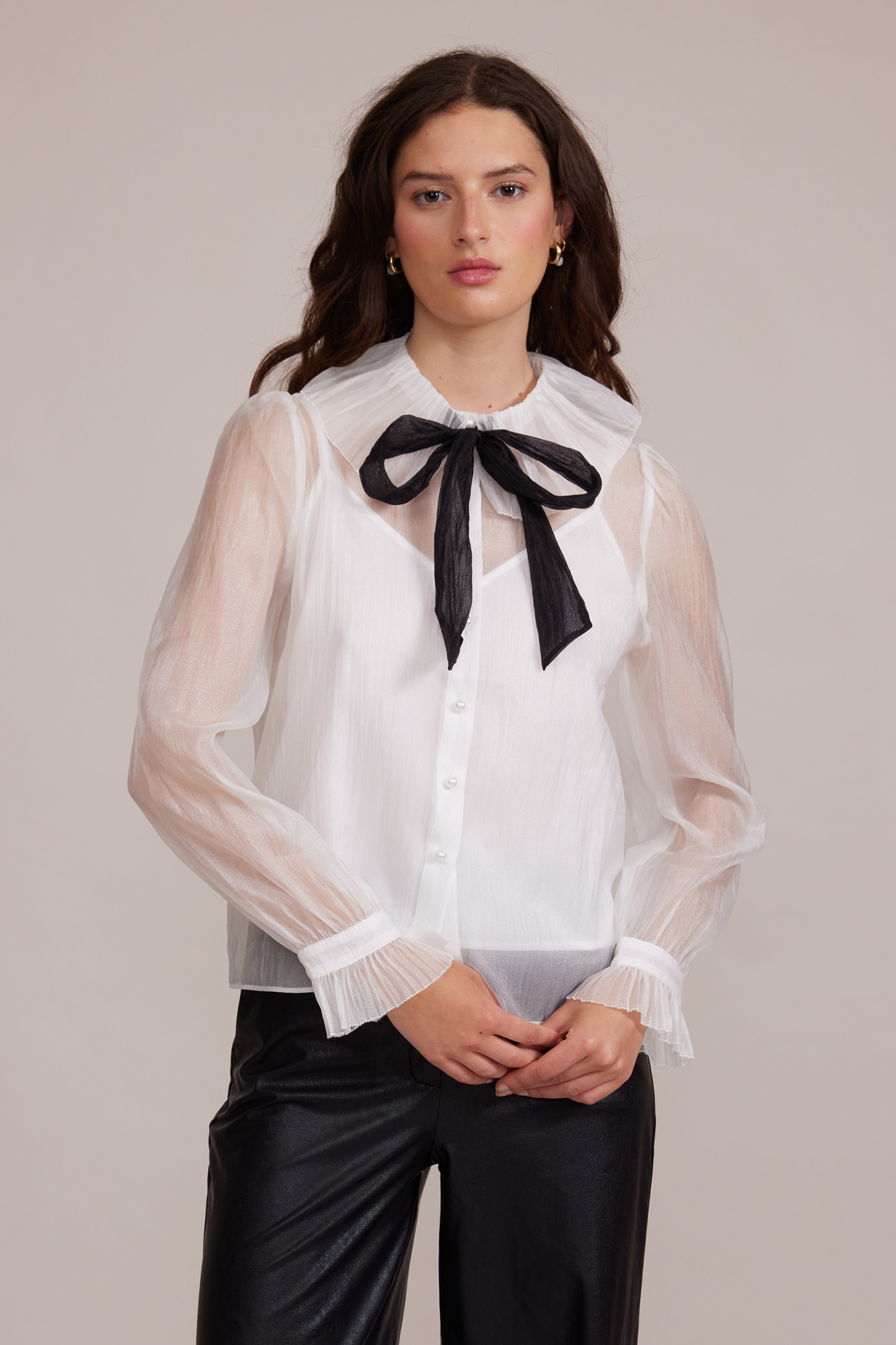 Dress up in the classic Garance Button Down! This blouse features a pearl button down closure, with ruffle trim on the sleeves, and a bow tie at the neckline to bring the look together.