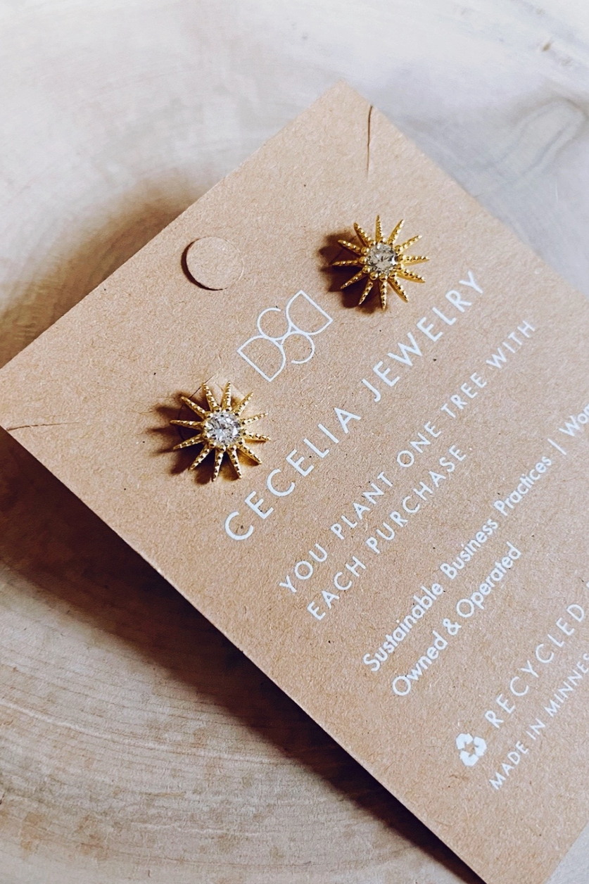 Shop our Gatsby Stud Earring Collection. You plant one tree with each purchase. These earrings are made with 14k gold plated sterling silver and come packaged on our kraft paper earring cards. We recommend displaying these on our swivel earring display.