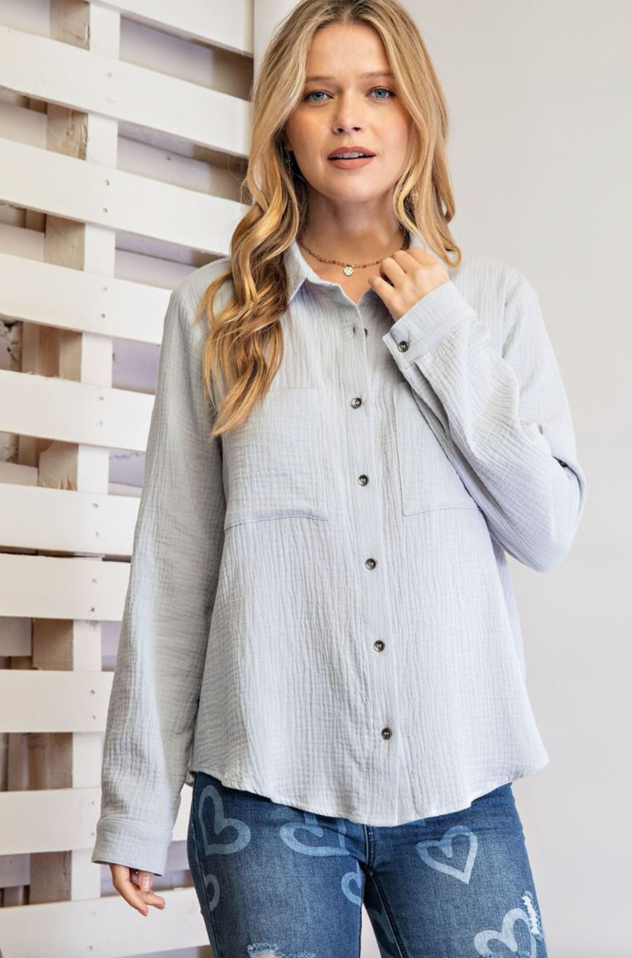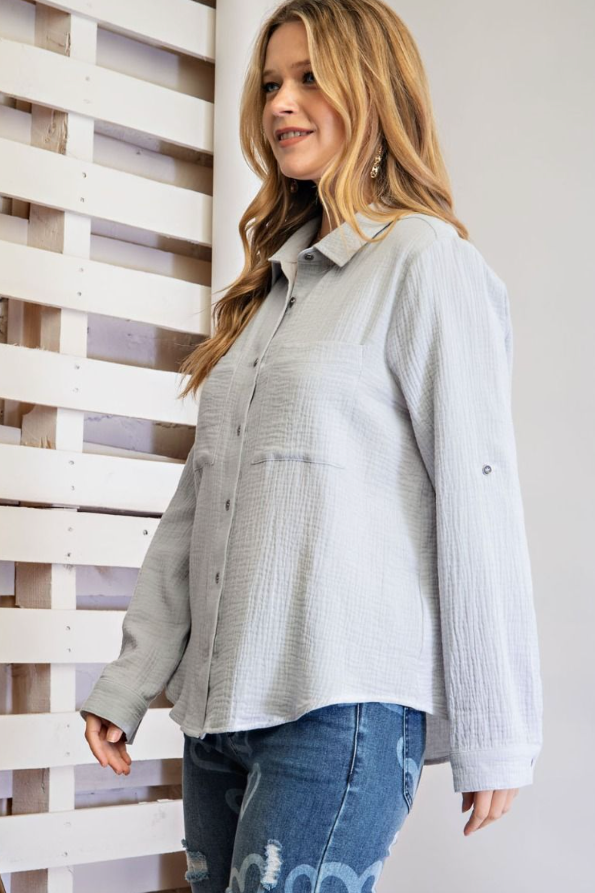This button-down top is super soft and looks cute buttoned up or worn open. Its lightweight has a chest pocket and button closure cuffs.