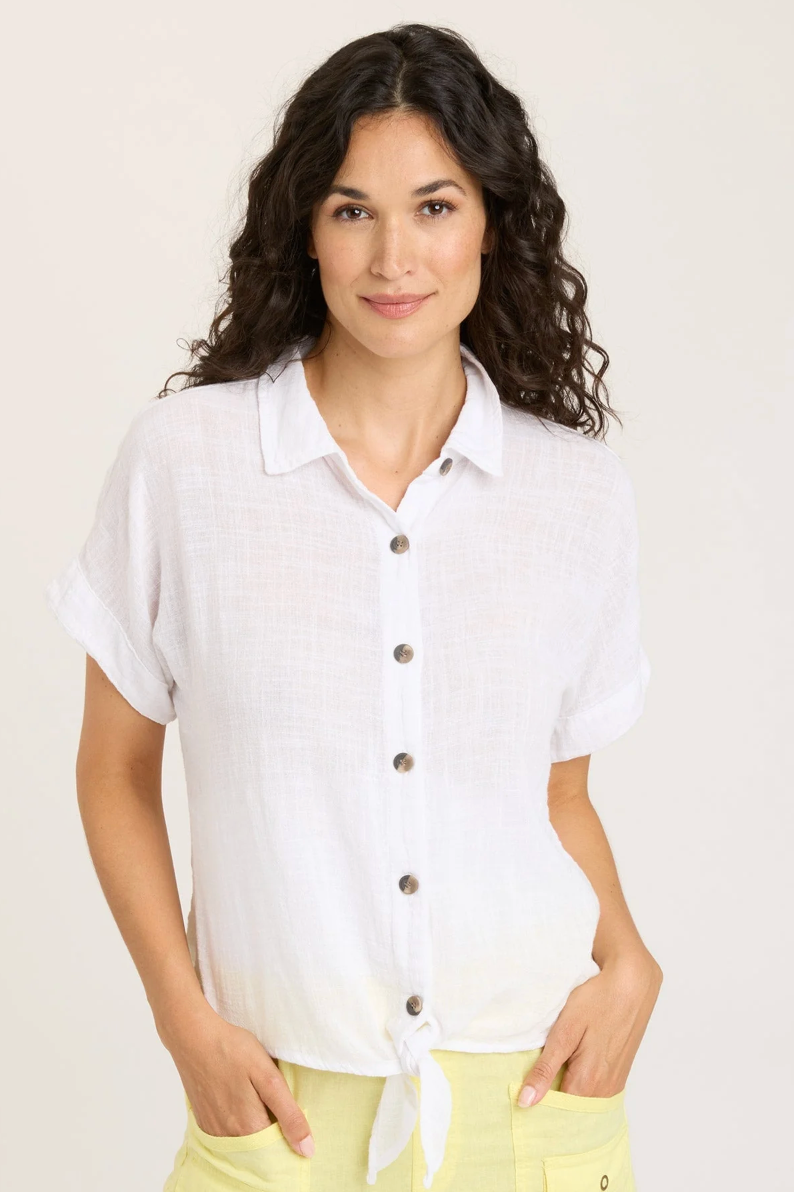 The Gauze Teagan Top is a classic that needs to be added to your closet! With a button front closure, tie front, and cuffed short sleeves, this top is a must.