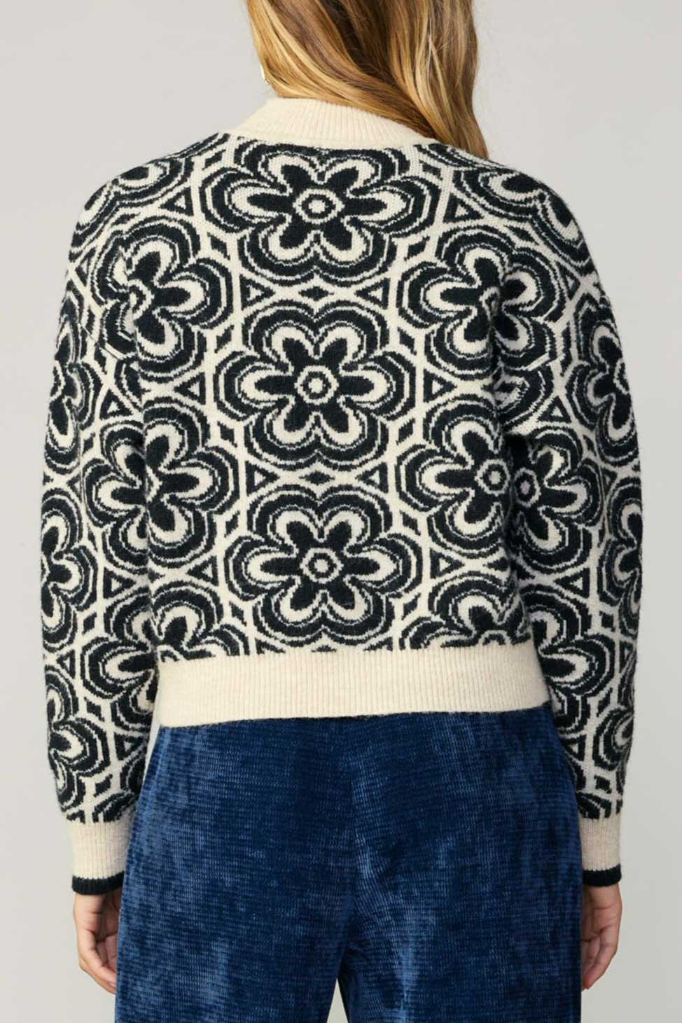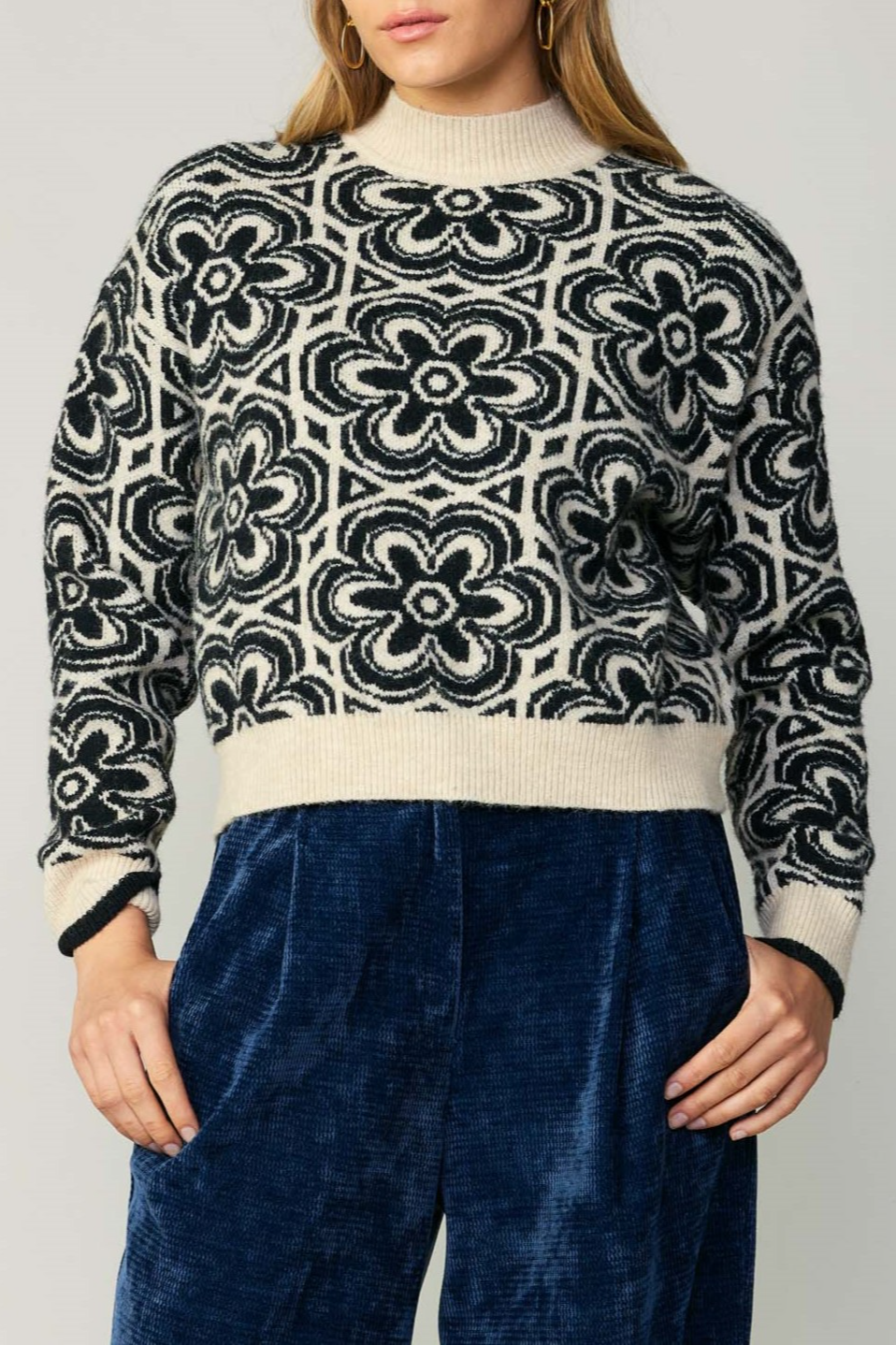 This sweater does a fun take on geometric shapes and incorporating flowers to make the pattern for this top. Can be worn with a textured pair of pants to continue the funky style of the sweater or can be paired with jeans.