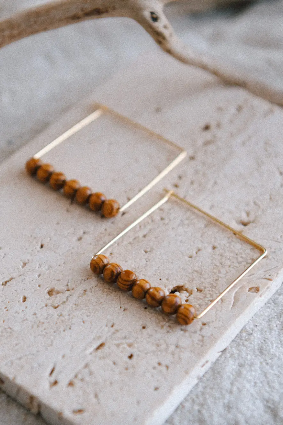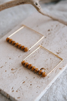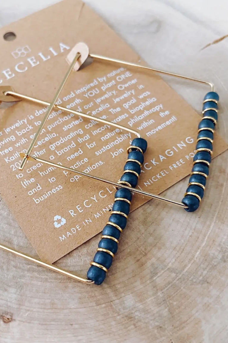 Shop our beaded rectangle hoop earring collection. You plant one tree with each purchase. These 14k gold plated earrings are made with glass beads and come packaged on our kraft paper earring cards. 2.5" x 1". Lightweight and versatile. We recommend displaying these on our swivel earring display.