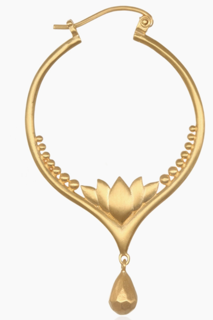 Lotus flowers—symbol of new beginnings and full potential—nestle into the base of these 18k gold plated hoop earrings; a golden teardrop dangles delicately to catch the light with each turn of the head.H- 2" W- 1.2"