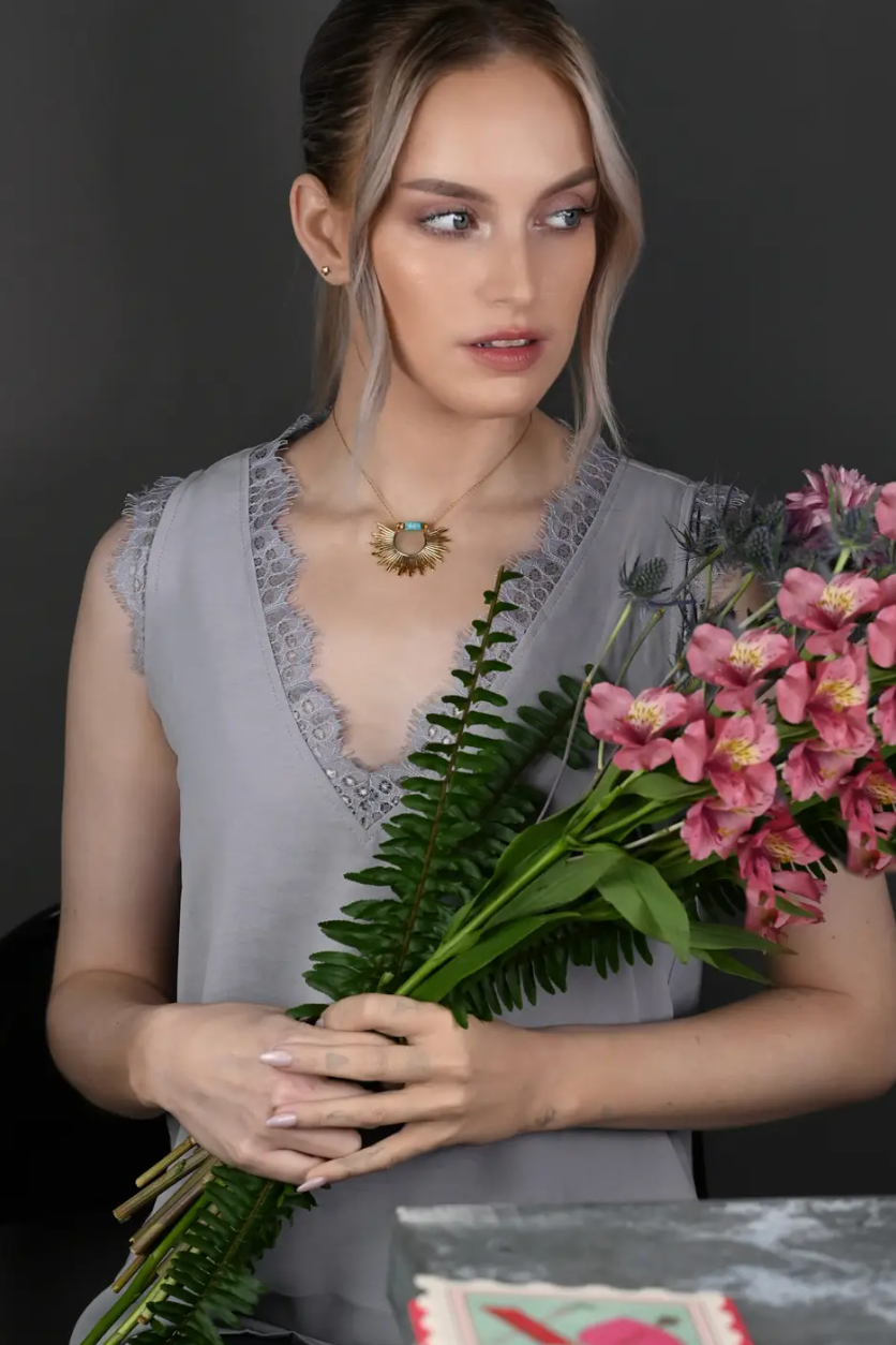 Just looking at this necklace makes me think of a vacation! It features a beautiful large sized Sun, Semi Precious Heishi beads of your choice on delicate vintage chain.