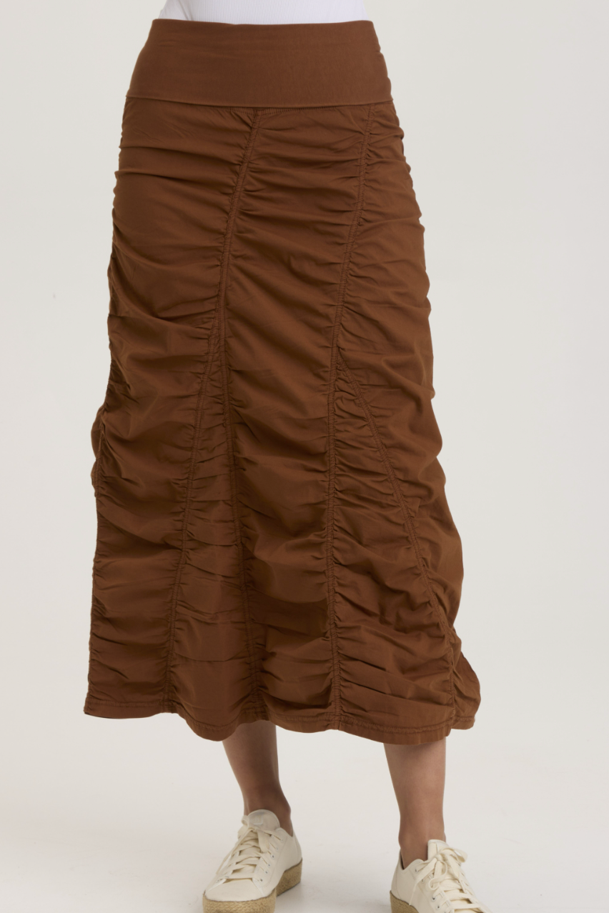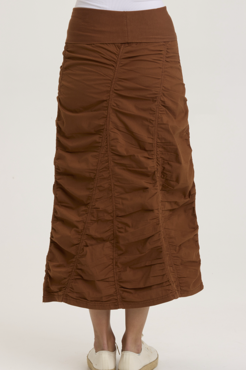 An old trusted style is back! Asymmetric seams run from the right and then to the left with shirring throughout each gored section. A foldover soft jersey waistband round out this classic style.