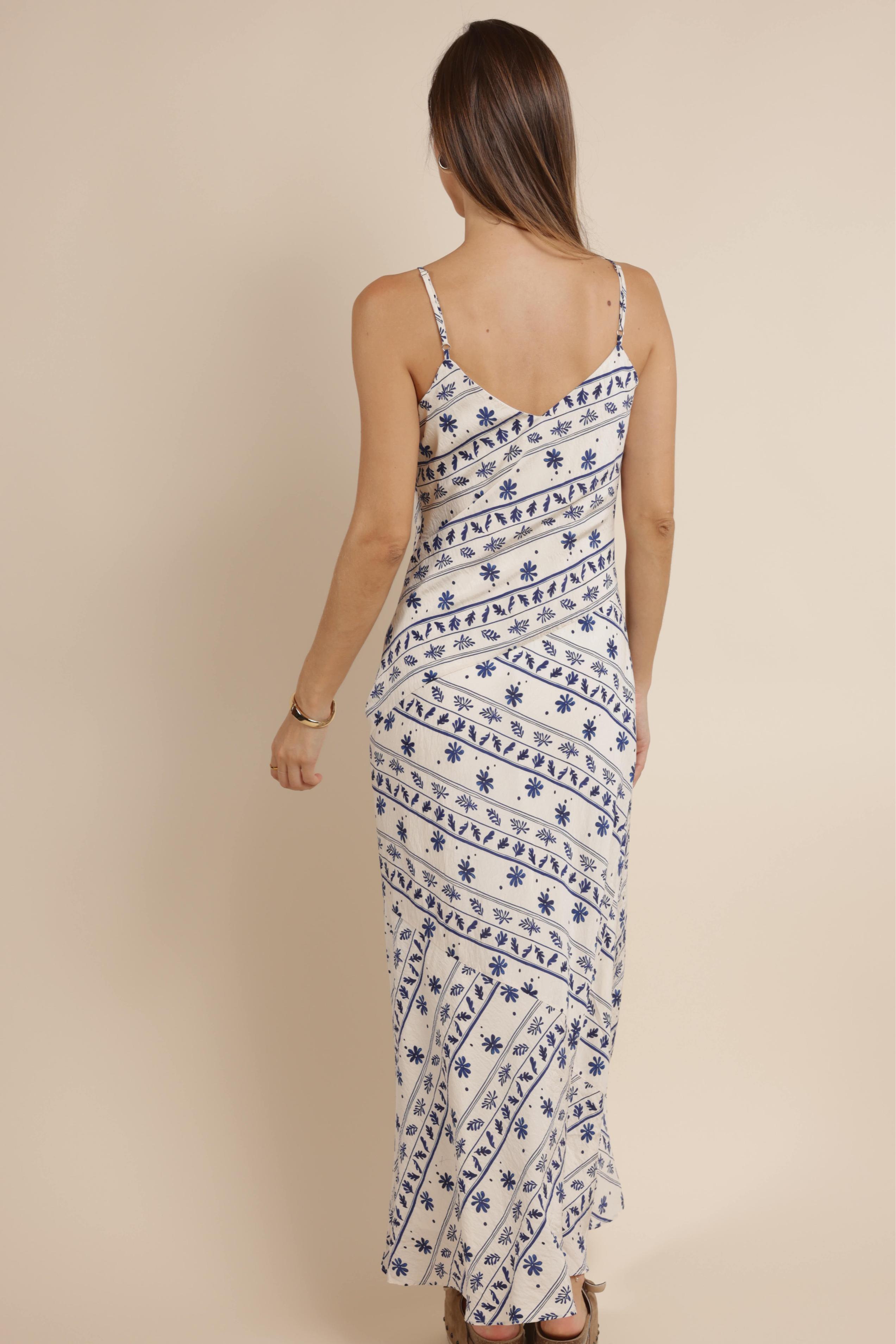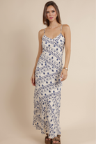 Breezy, beautiful, and effortlessly feminine, the Great Springs Printed Maxi Slip Dress is your go-to for warm-weather days. Featuring a delicate spaghetti strap design and a flowy silhouette, it skims the body with grace and ease. The eye-catching blue and white geometric floral print adds a touch of boho charm, while the lightweight fabric keeps it comfortable and breathable.