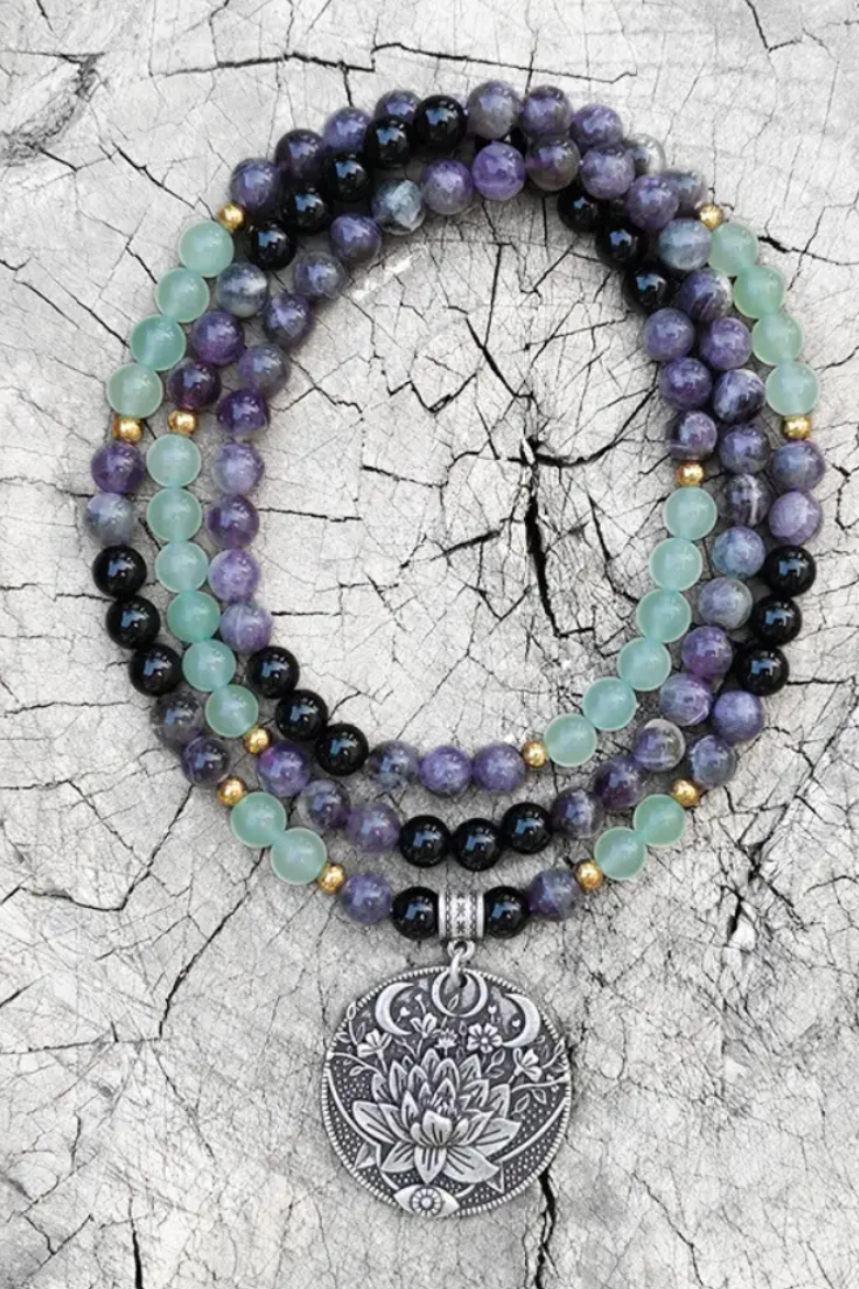 Discover abundance and protection with our elegant 108 Mala Bead Necklace, thoughtfully crafted from Green Aventurine, Amethyst, and Black Onyx gemstone beads, complete with a stunning spiritual pendant. This mala bead necklace is not only a tool for meditation but also a symbol of balance, clarity, and spiritual empowerment.