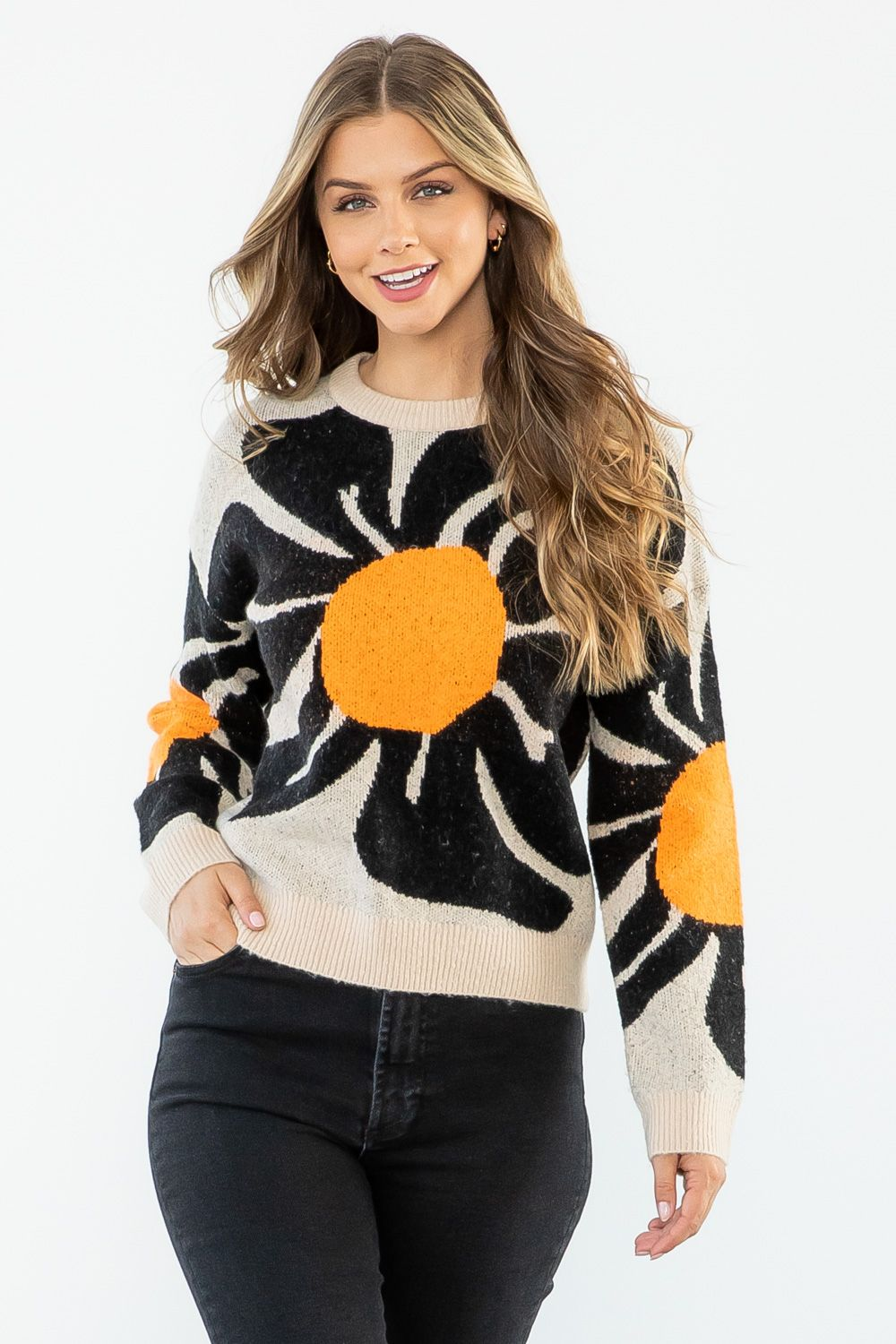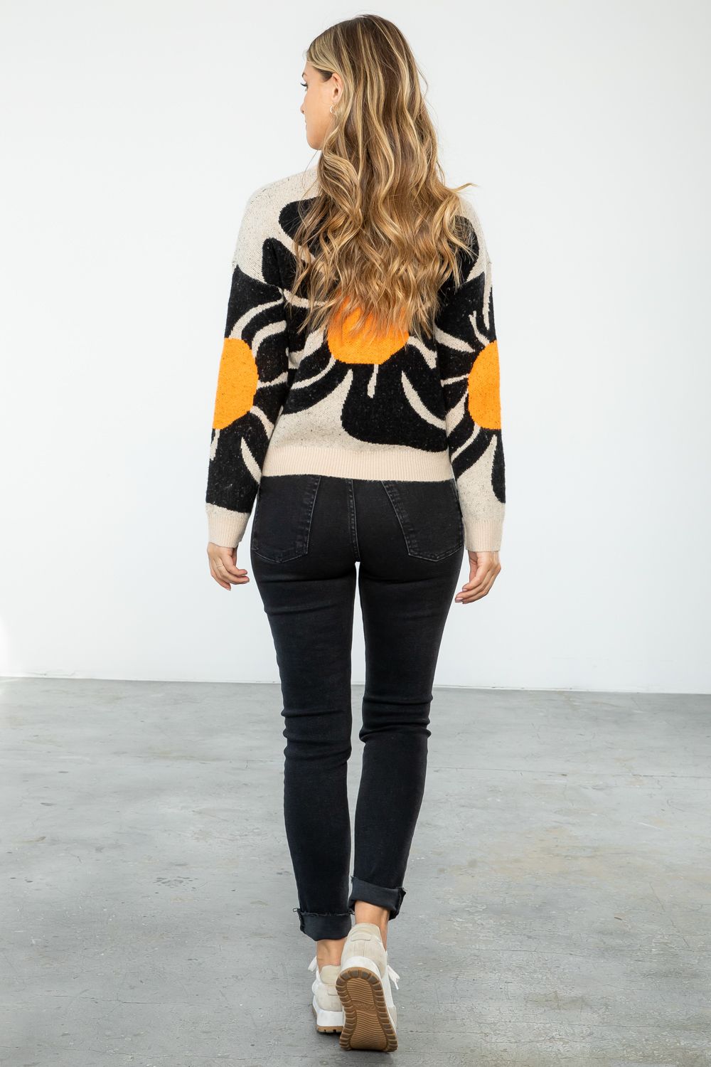 This groovy knit sweater has a flower. Looks great with dark washed jeans and sneakers.