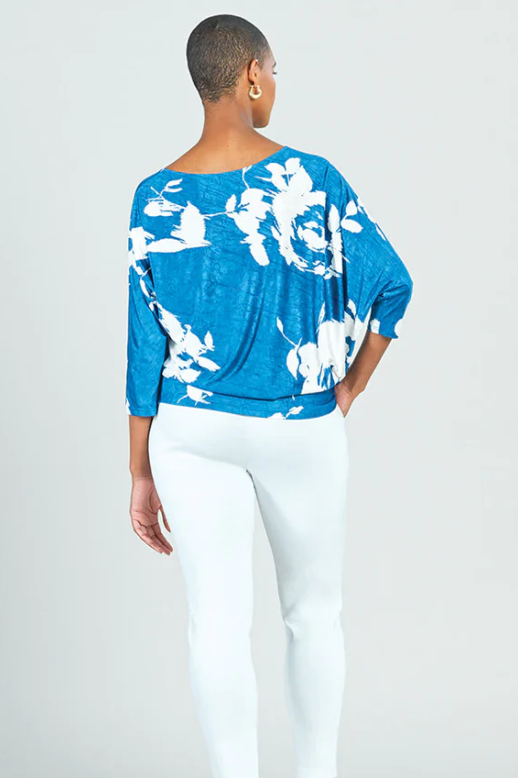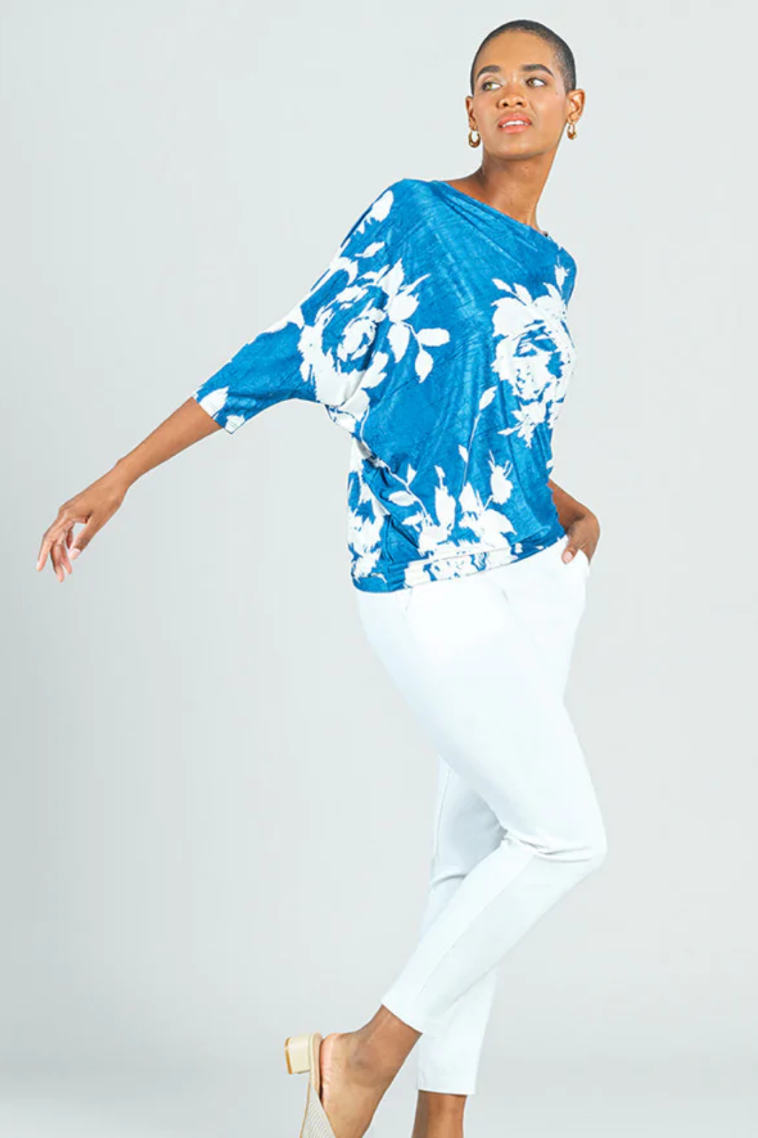 Our Dreamy Floral Crush Silk Half & Half Sleeve Top is what sweet dreams are made of! This top features a round neckline, left dolman sleeve and fuller right batwing sleeve both in 3/4 length, with an angled hemline.