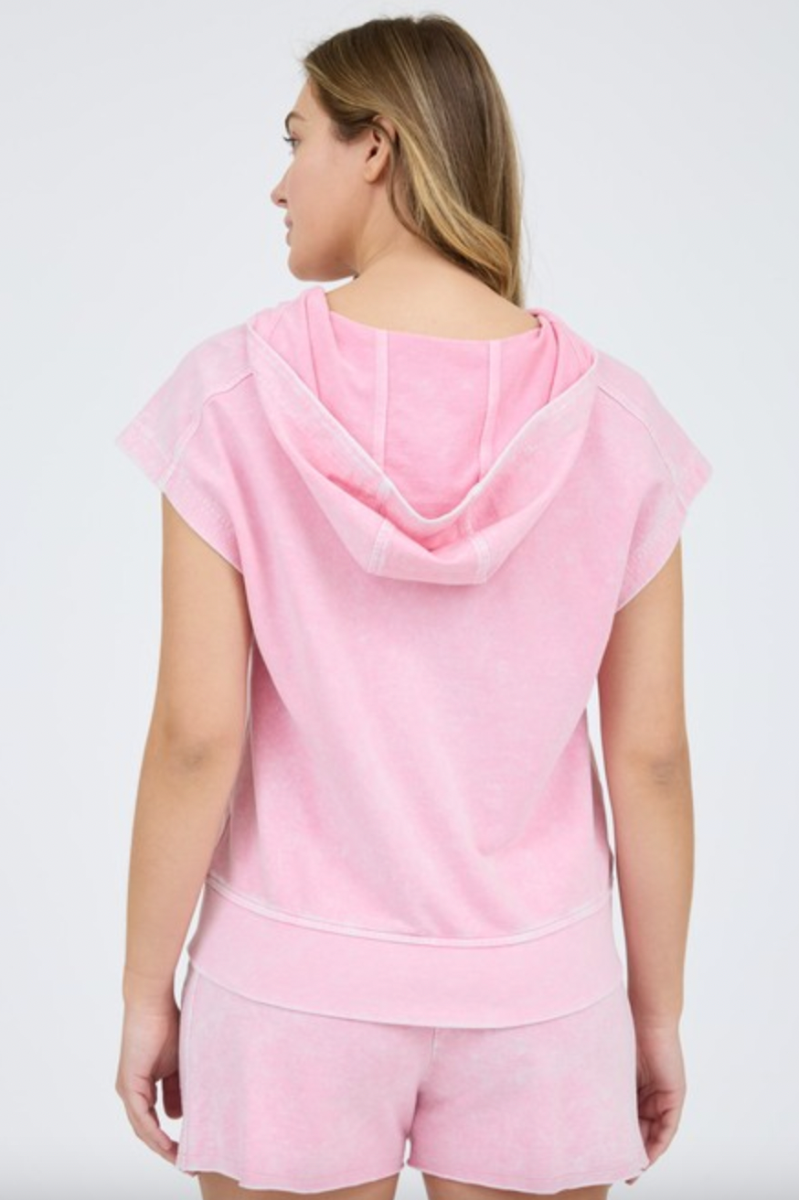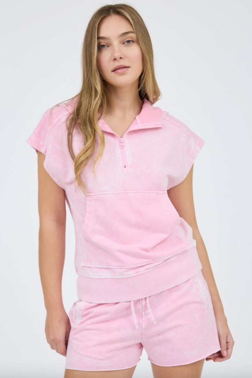 Washed Hooded Half Zip Short Sleeve Knit Top