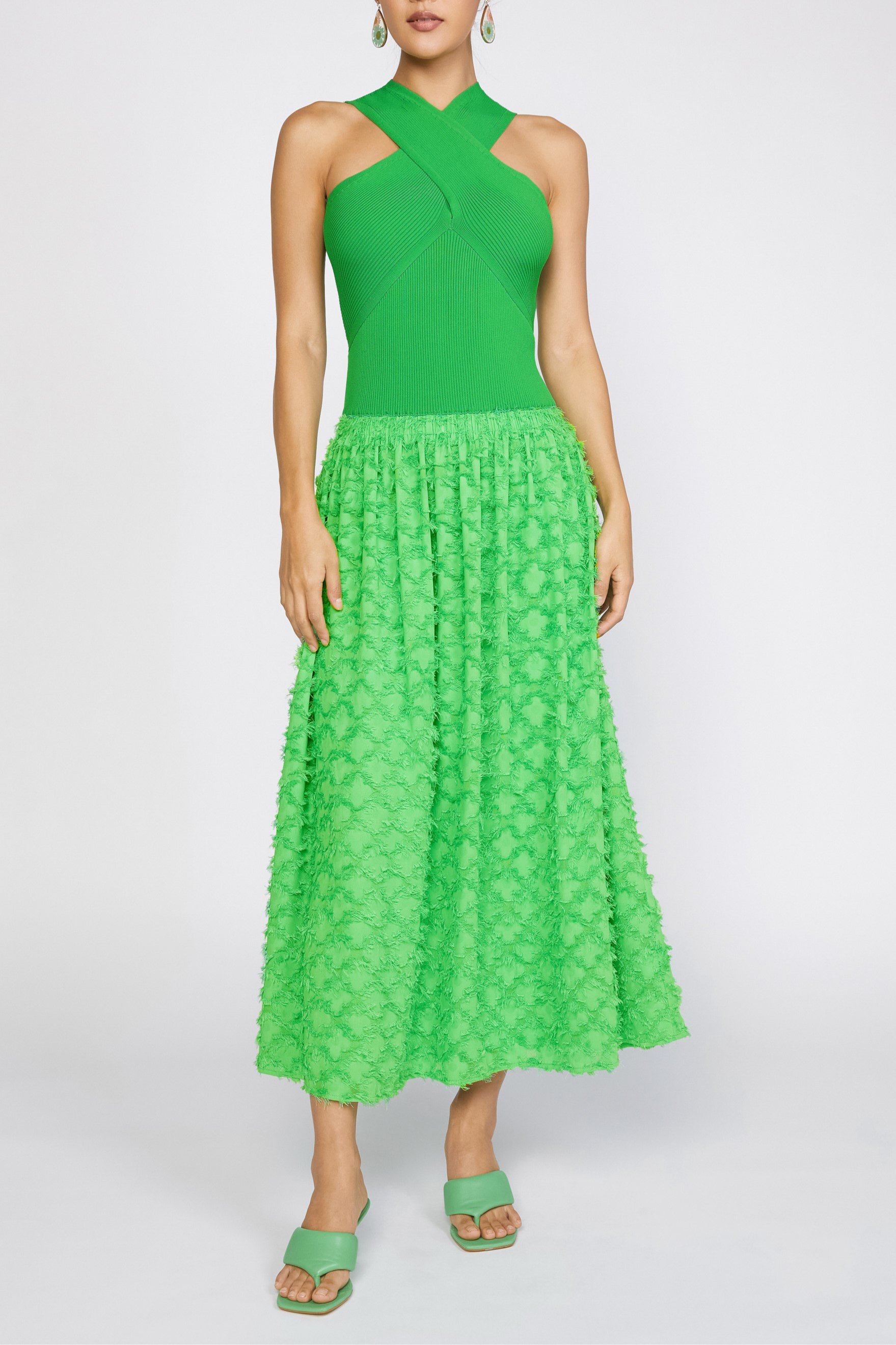 This dress is beautiful with the textured detail displayed on the bottom with the cross halter sweater on the top.