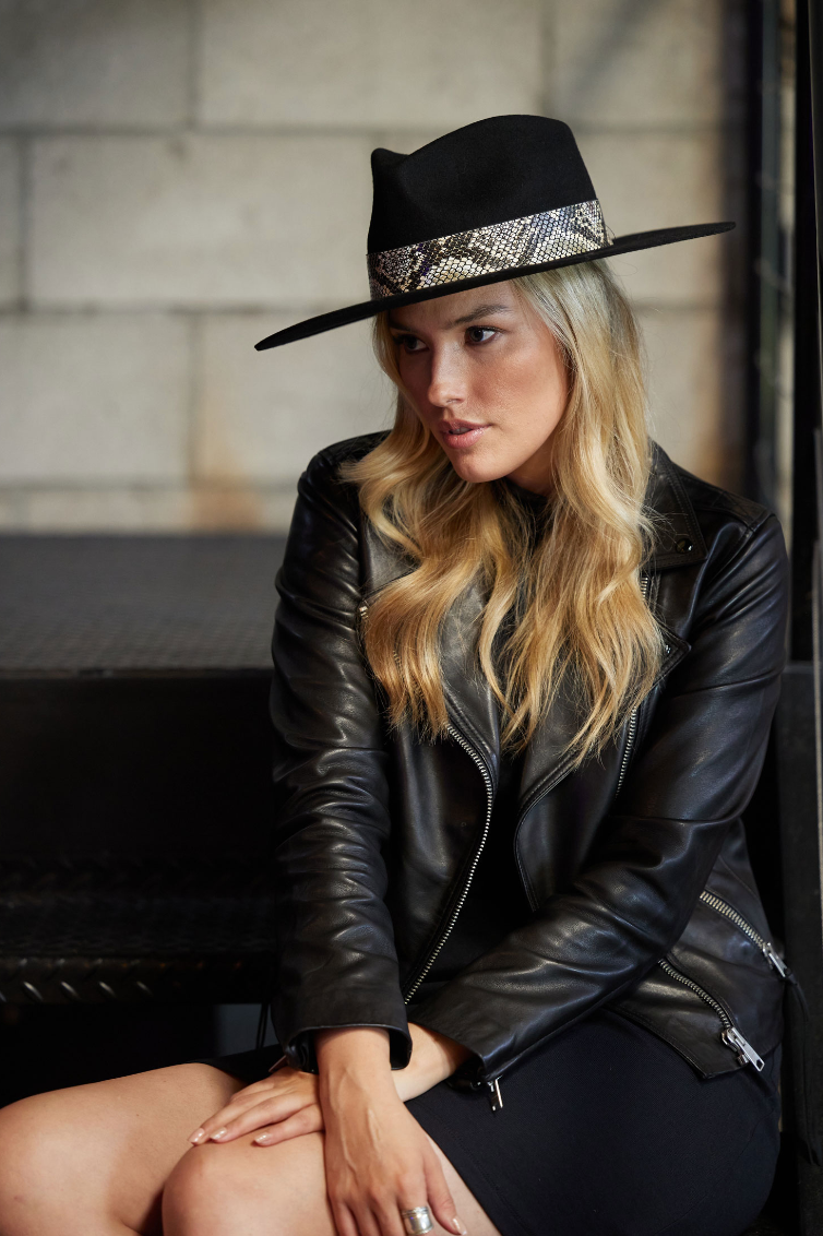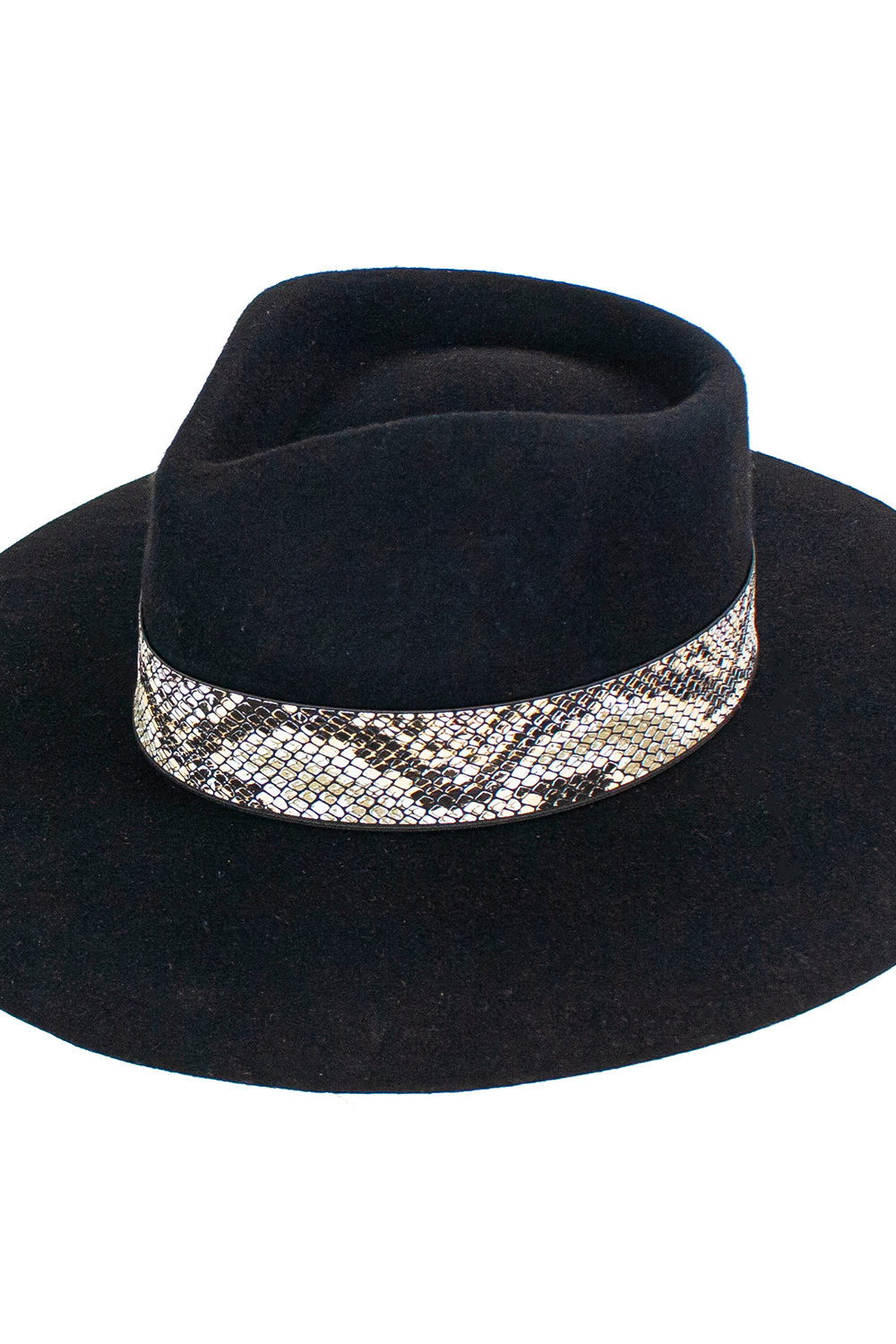 Felt hat with wide brim. Snake inspired ribbon detail, pair with a vegan leather jacket and head out the door