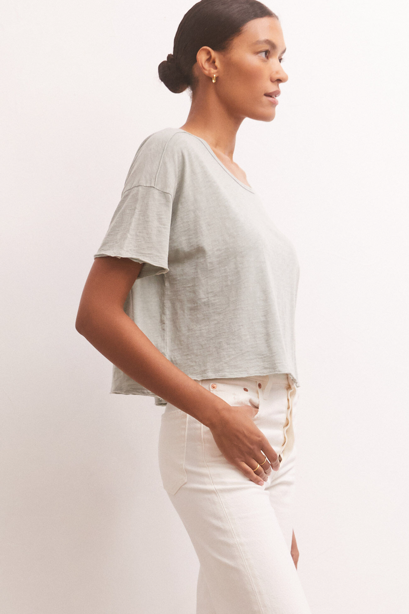 Relaxed with a boxy shape, this crew neck is so easy to wear! The Hazel Slub Tee, made using our Cotton Slub Jersey fabric, features raw edge details, a center back seam, and a step hem with side vent detail. Fabric Content