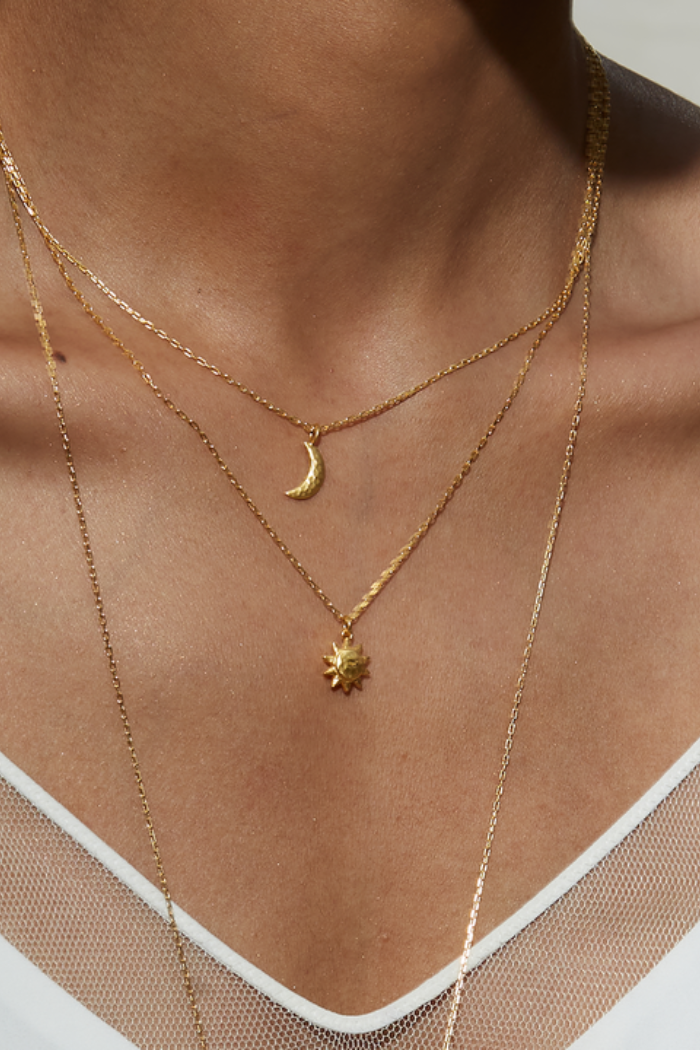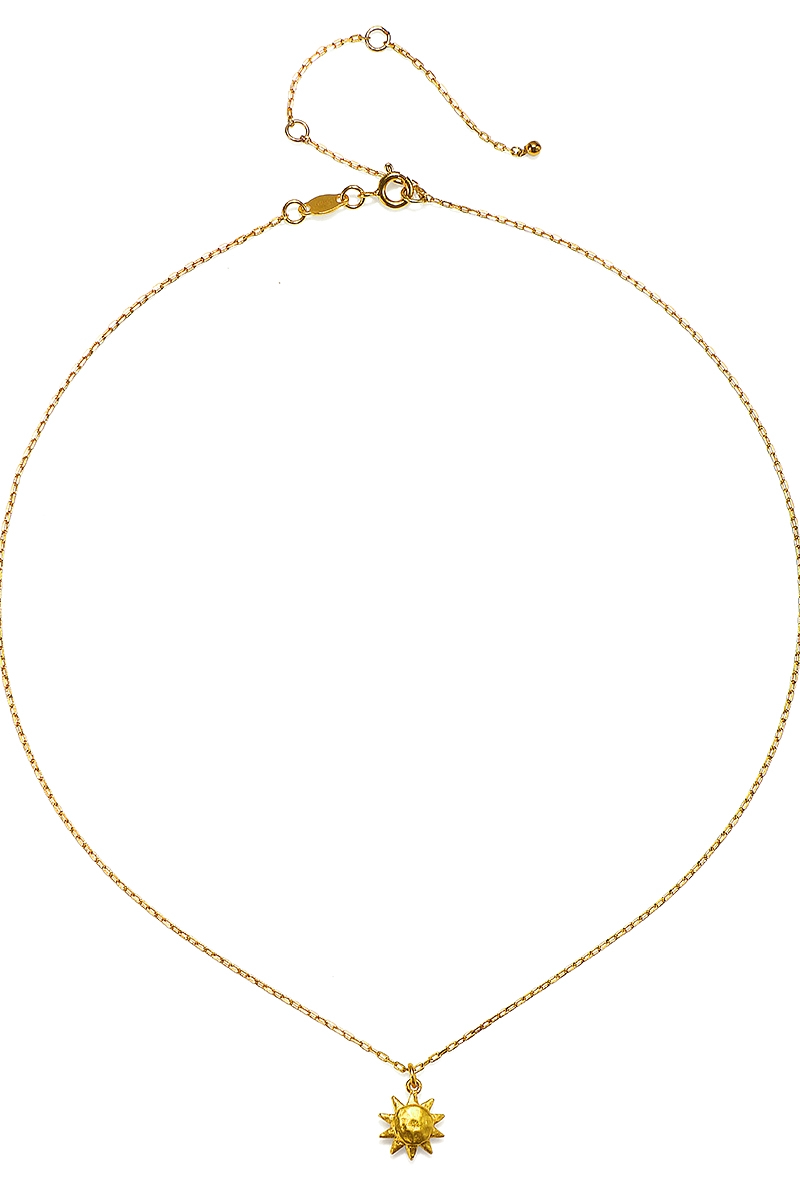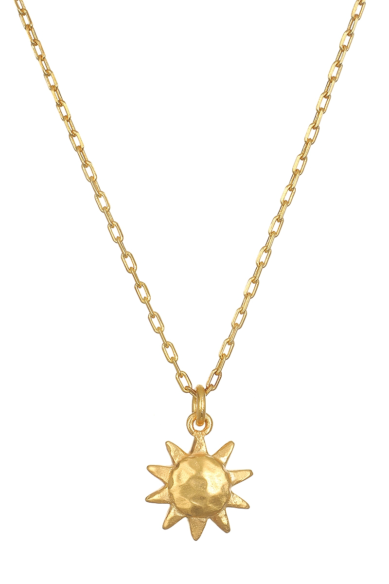 With every dawn, the sun emerges from darkness, reminding us that light—and life—will always persevere. A brilliant sun in hammered 18k gold plate glimmers on a delicate chain for a necklace to inspire a fresh start.