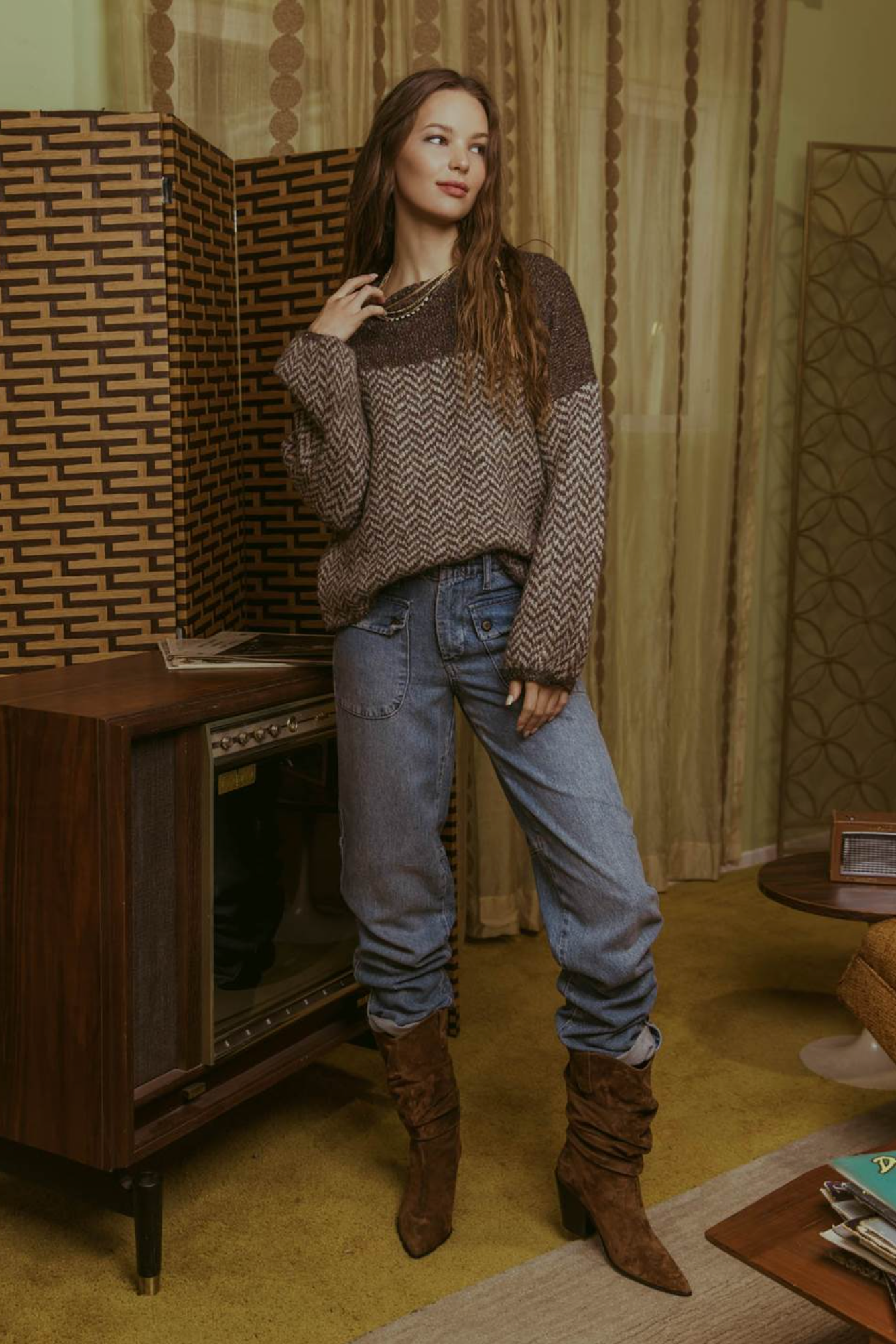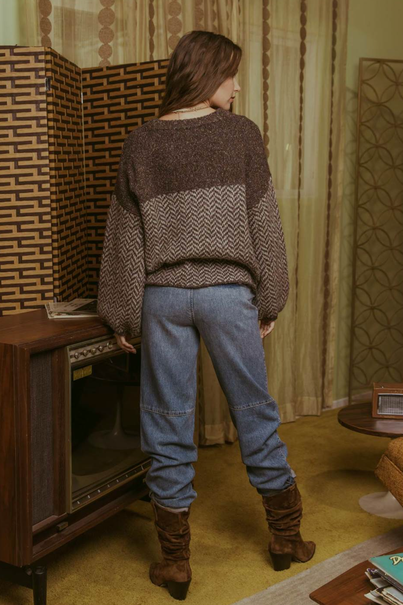 This cozy knit sweater gives grandpa chic. It looks great with black or denim bottoms. It is oversized without being too big.