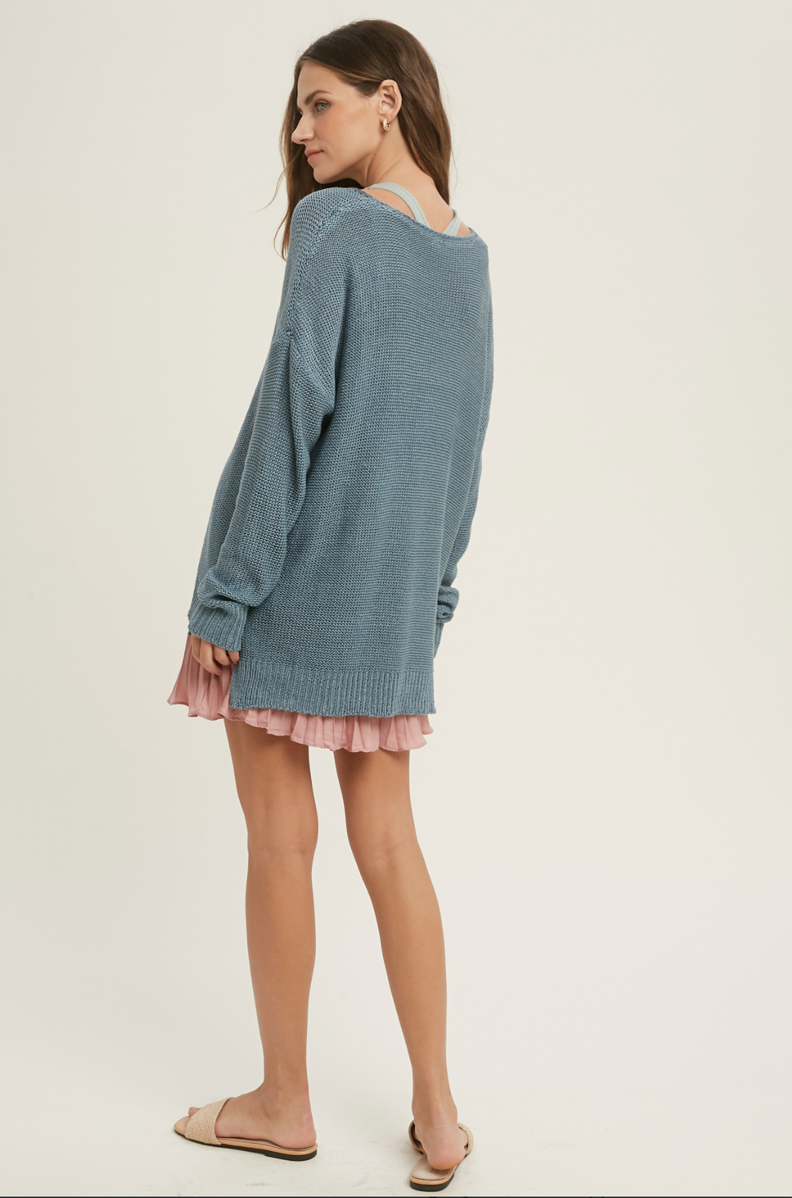 This knit sweater is a great casual summer sweater. The hi-low bottom makes it easy to layer with and the side slit detail creates a relaxed fit.