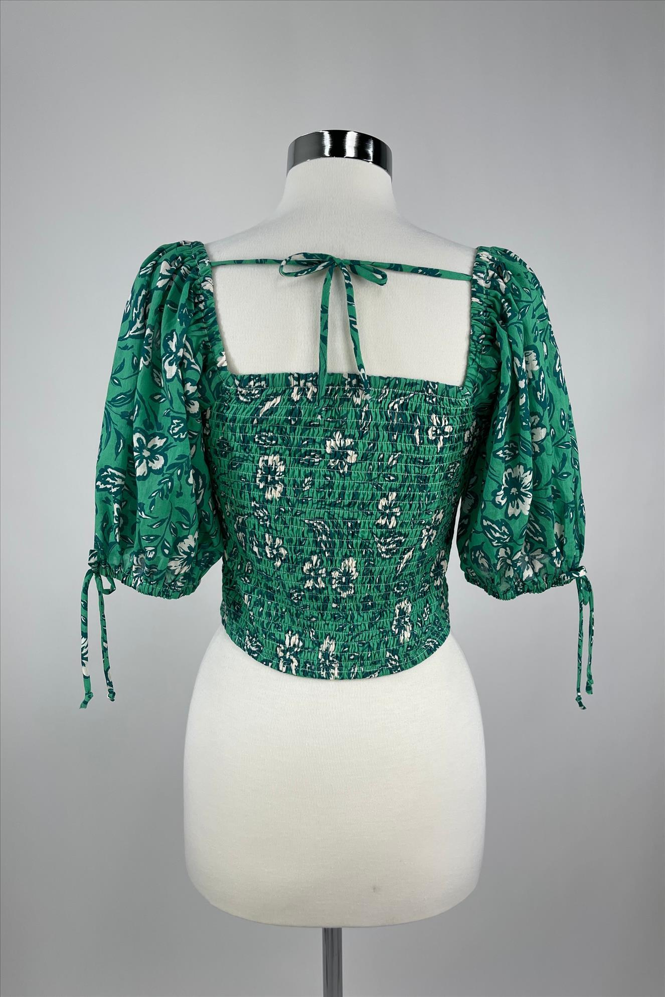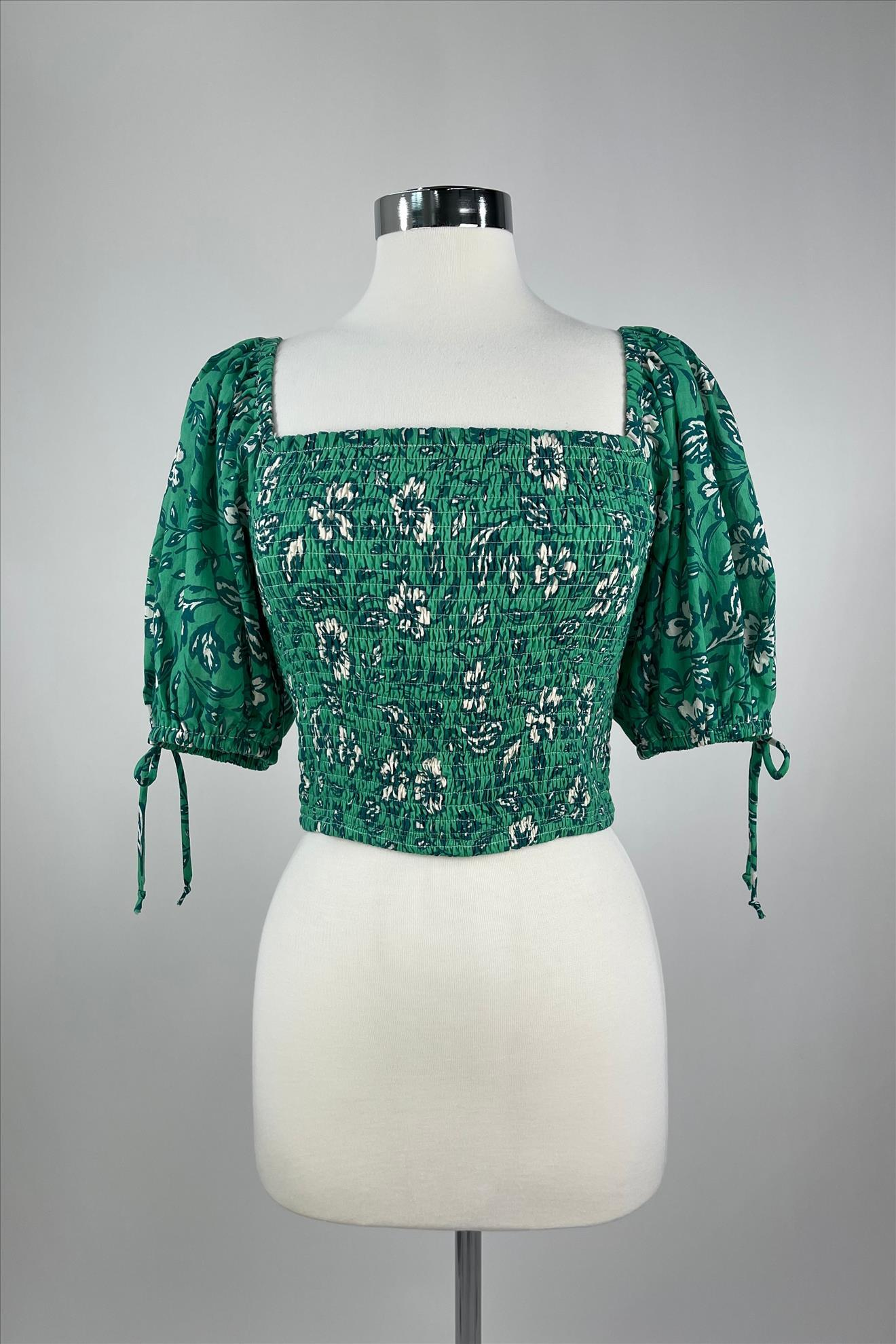 Woven Cotton Floral Print Square Neck Cap Short Sleeve Top With Smocking