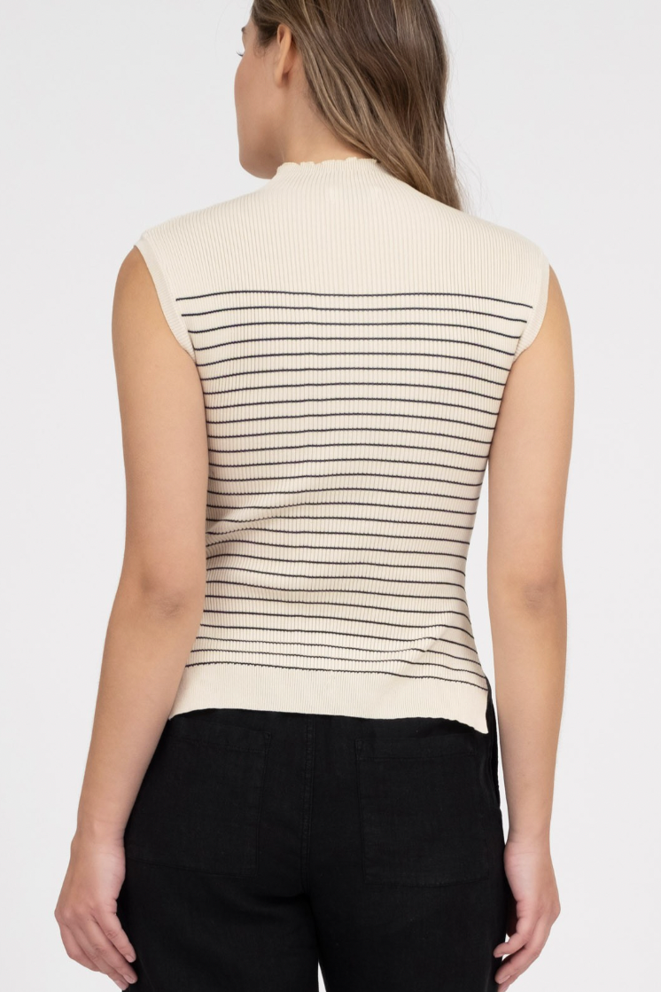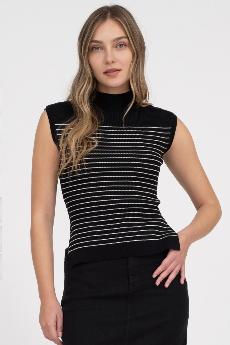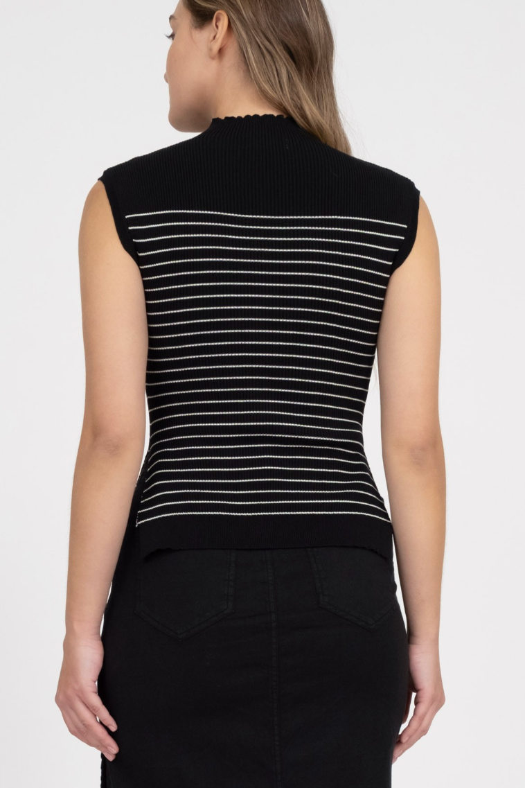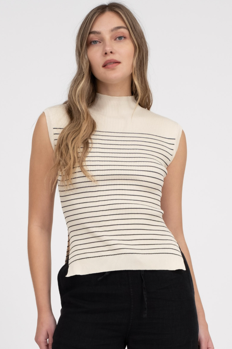 Stripe Mock Neck Sleeveless Side Slit Sweater