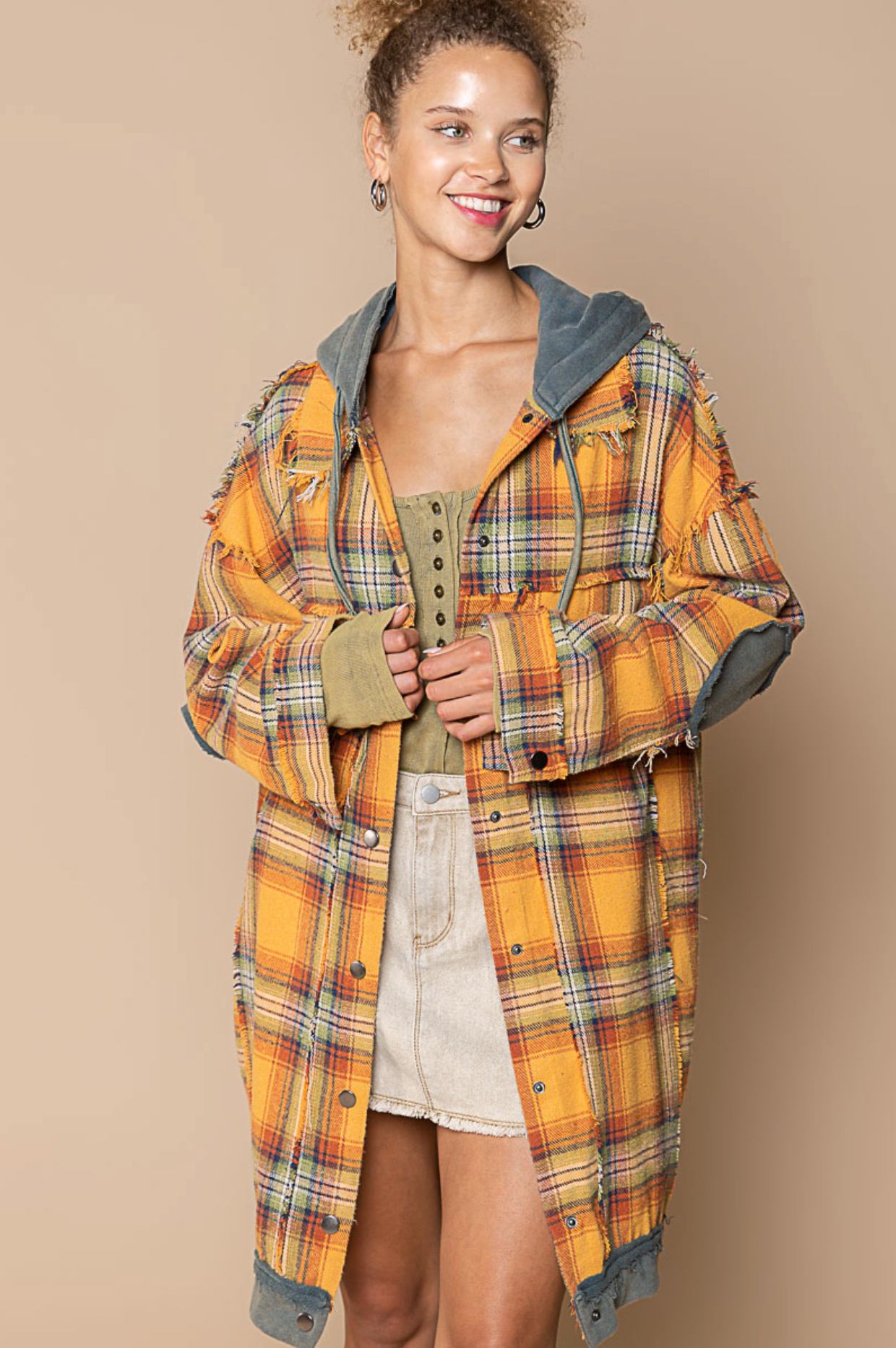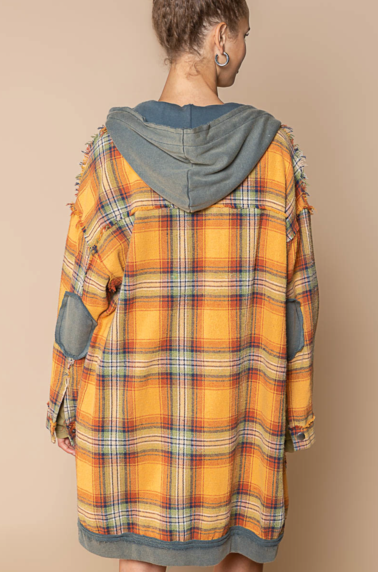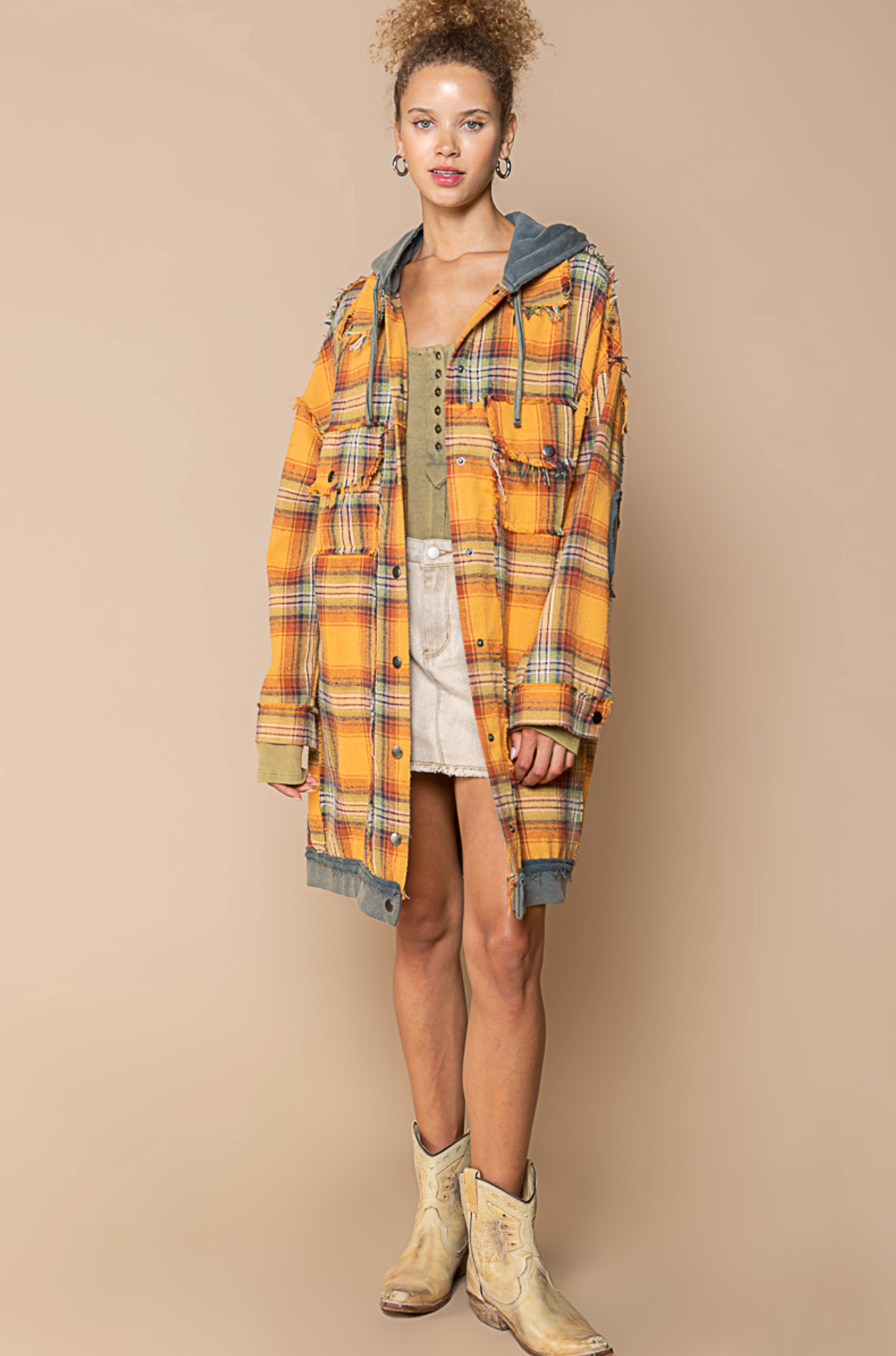 This plaid jacket is easy to layer with for Fall. Looks great with fitted bottoms and a basic layering top. Designed in plaid trucker jacket, oversized fit, button down, dual front chest pocket, hoody, raw edge/distress detailing throughout. Featured in plaid woven and french terry.
