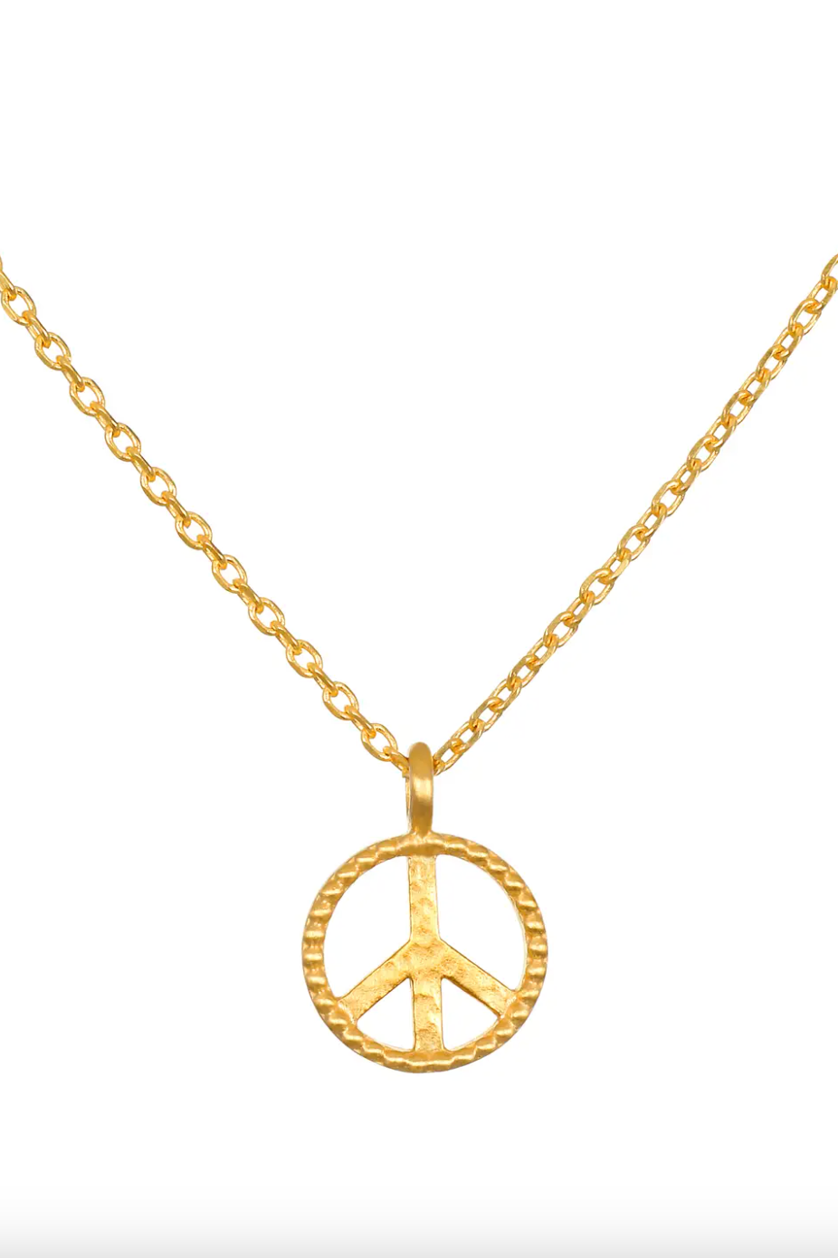 In our pursuit of peace, we awaken to it possibility; we open ourselves to compassion, empathy, and tranquility. An 18kt gold plated necklace shines with a peace insignia; delicate beading around the edge lends eye-catching detail. Wear this to manifest peace.