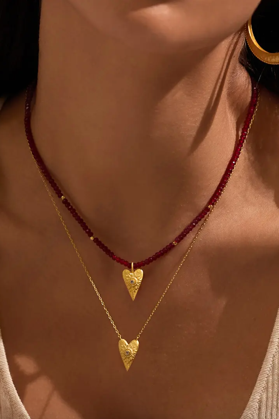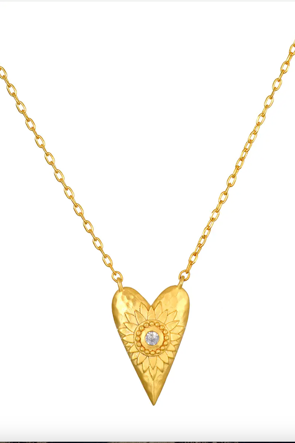 When you follow your truth, love will appear; you will discover you are infinitely loved by the Universe. A heart pendant necklace in 18kt gold plate is inscribed with a detailed flower and accented with a gleaming white topaz, stone of individuality, creativity, and awareness. On the back, a delicate inscription reads the mantra: I Am Loved. Wear this necklace to open your heart or to manifest love in abundance.