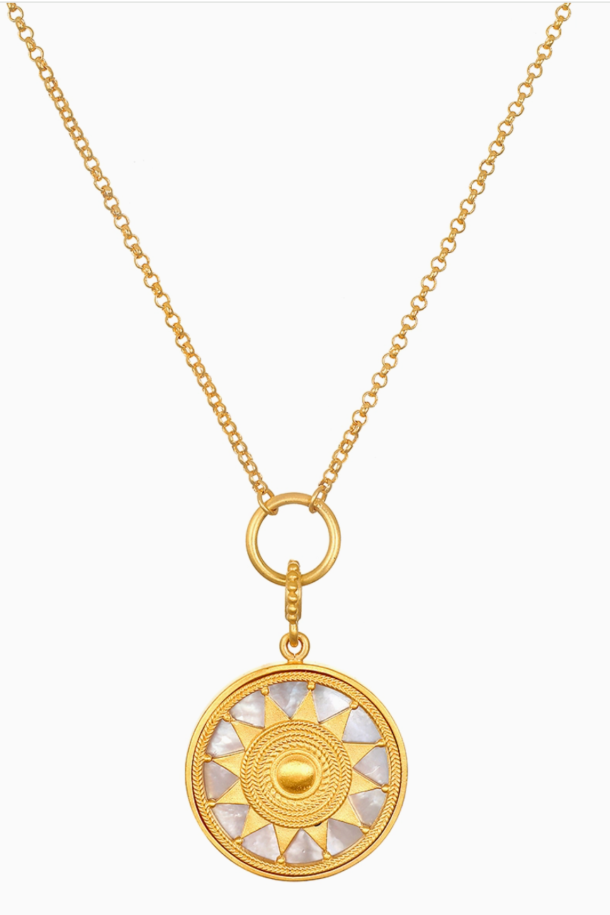 Among the heavenly bodies of the midnight sky, a sacred realm exists: a place where our imaginations soar without limits. An intricately detailed crescent moon cradles a spinning sun—symbols of the goddess and vitality—for an 18kt gold plated pendant necklace that captures the grace and movement of the celestial bodies by which we map our lives.