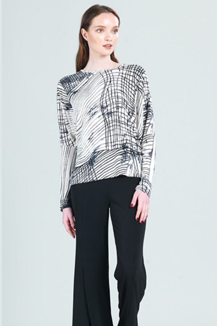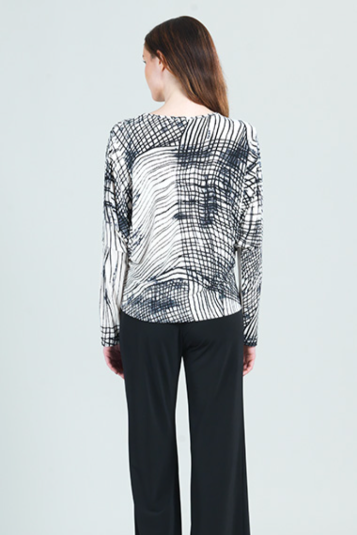 Interlaced lines soft knit dolman top that is wrinkle-free and travel-friendly. Great with a pair of black palazzo pants.