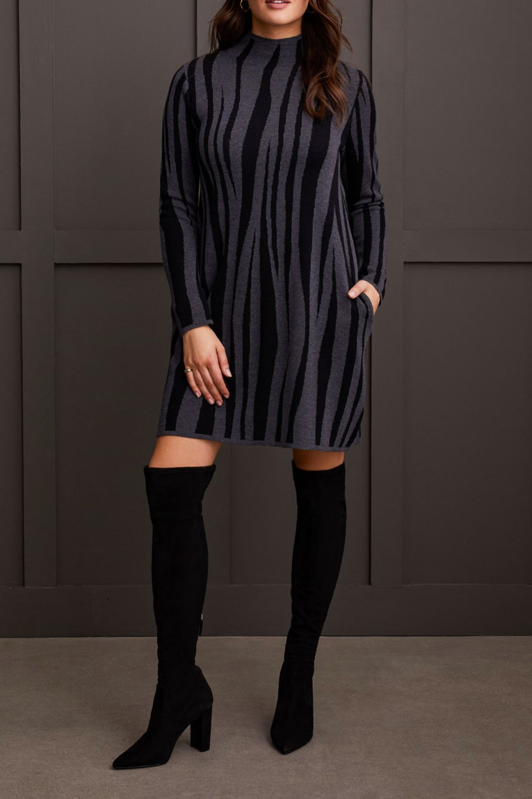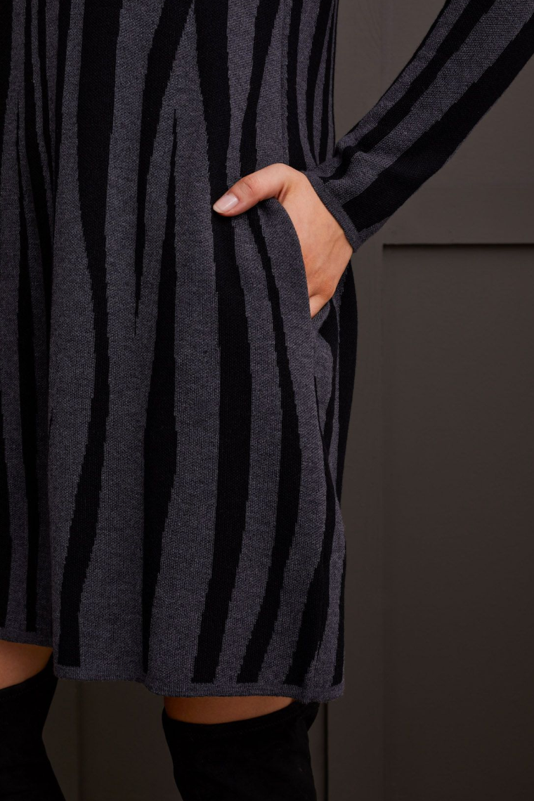 Funnel neck dress in black and charcoal jacquard pattern. Dress has side slit pockets. Wear this as a dress or with leggings for an edgy fall outfit.