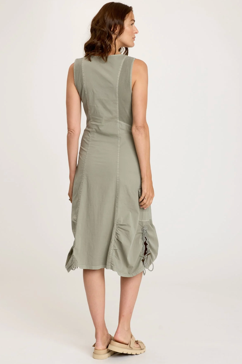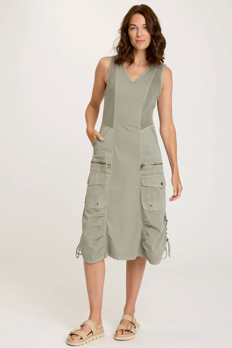 The Janelle Dress has a V-Neck as well as adjustable ruching and gathered paneling. This dress has a curve-hugging fit, with cargo and zipper pockets to add a utilitarian style to this item.
