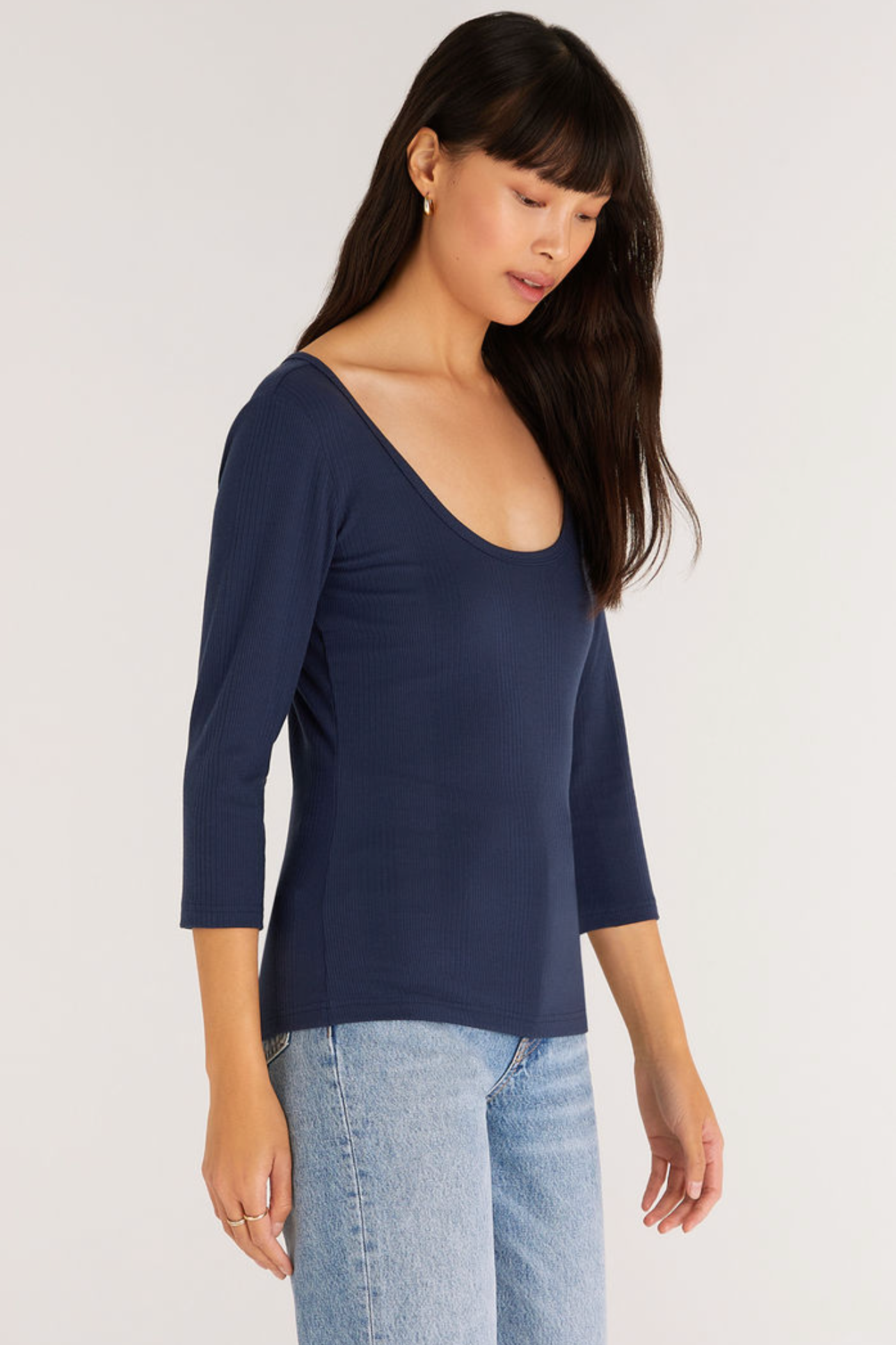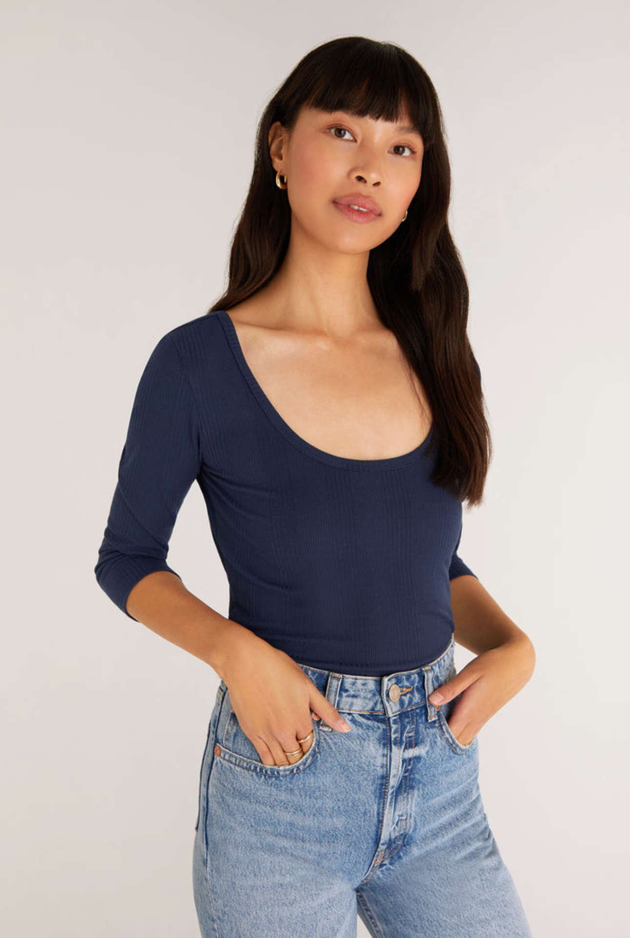 A staple on its own or the perfect layer, the Jayda Rib ¾ Sleeve Top is designed with a slim silhouette in a variegated stretch ribbed fabrication. This top looks so good tucked into those favorite high-waisted denim pants.