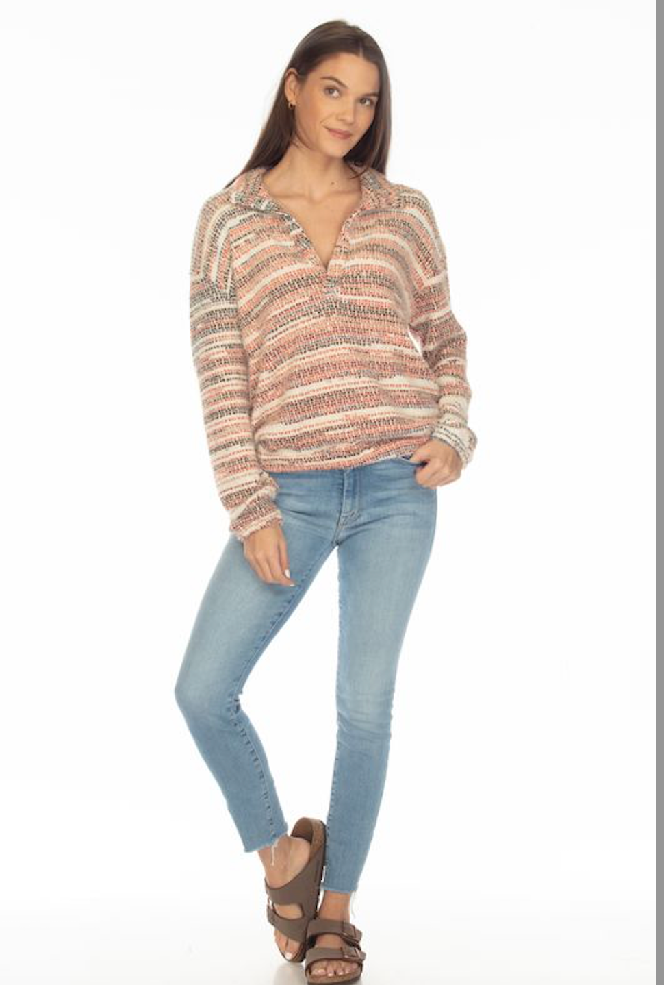 Long sleeve v-neck pullover with collar in subtle rust combinations. Wear with jeans or joggers.